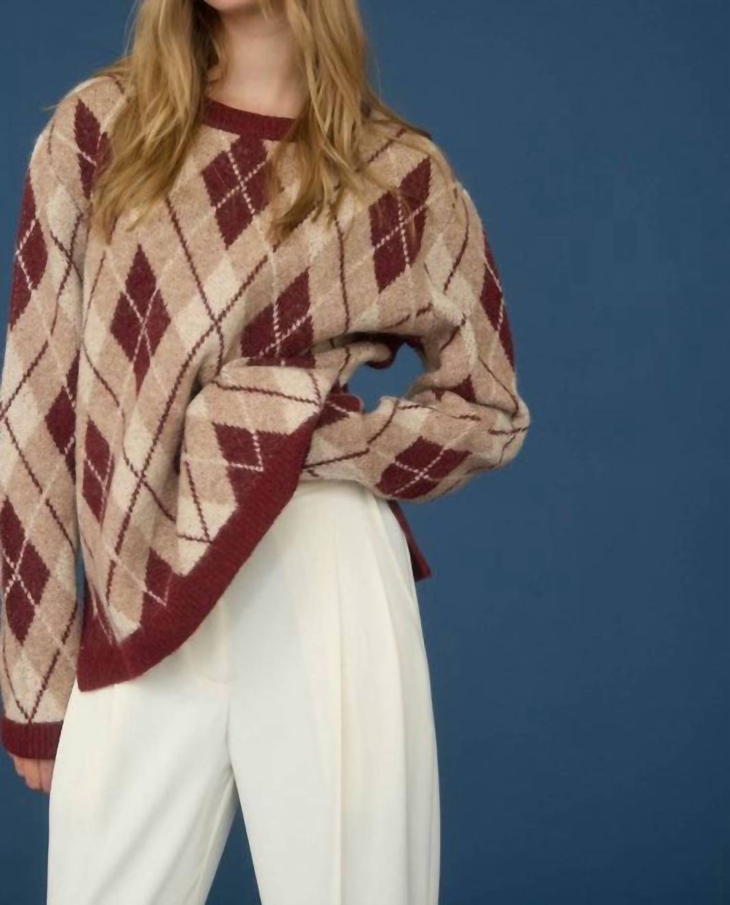 Experience the perfect blend of comfort and style with this trendy crew neck sweater, designed to effortlessly elevate your wardrobe. Pair it with your favorite denim and loafers for the perfect look. Wrap yourself in the plush comfort of the Argyle Pattern Crew Neck Sweater by MOON RIVER, a statement piece in Burgundy Multi. Tailored with long sleeves and a drop shoulder design, this sweater offers a relaxed yet stylish fit, perfect for layering. Made from a blend of 50% Recycled Polyester, 15% Polyester, 13% Acrylic, 13% Nylon, 6% Wool, and 3% Spandex, it ensures warmth without bulk. Closure: Pull on. Care: Hand wash, line dry. Ideal for dinner parties this spring, it’s a versatile addition to any preppy wardrobe.
