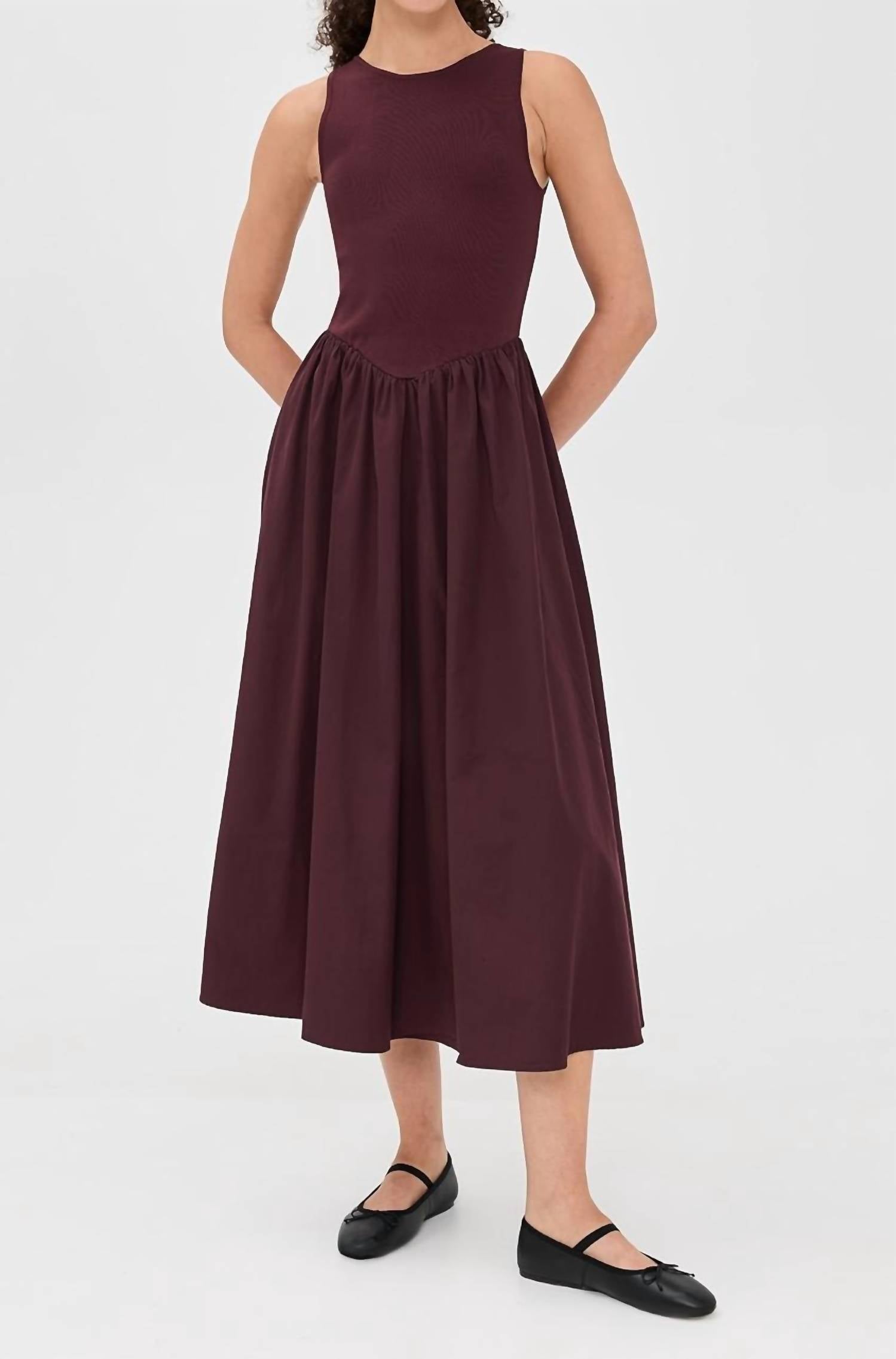 The perfect length dress does exist. This imported midi-length tank dress is made from unlined, mid-weight non-stretch poplin and features a ribbed knit bodice. The shell consists of 65% polyester and 35% cotton, while the trim is 65% rayon and 35% nylon. This sleeveless, pullover garment has no closures and requires hand washing. The model (5'11") wears a size small, though she typically wears size XS–S.