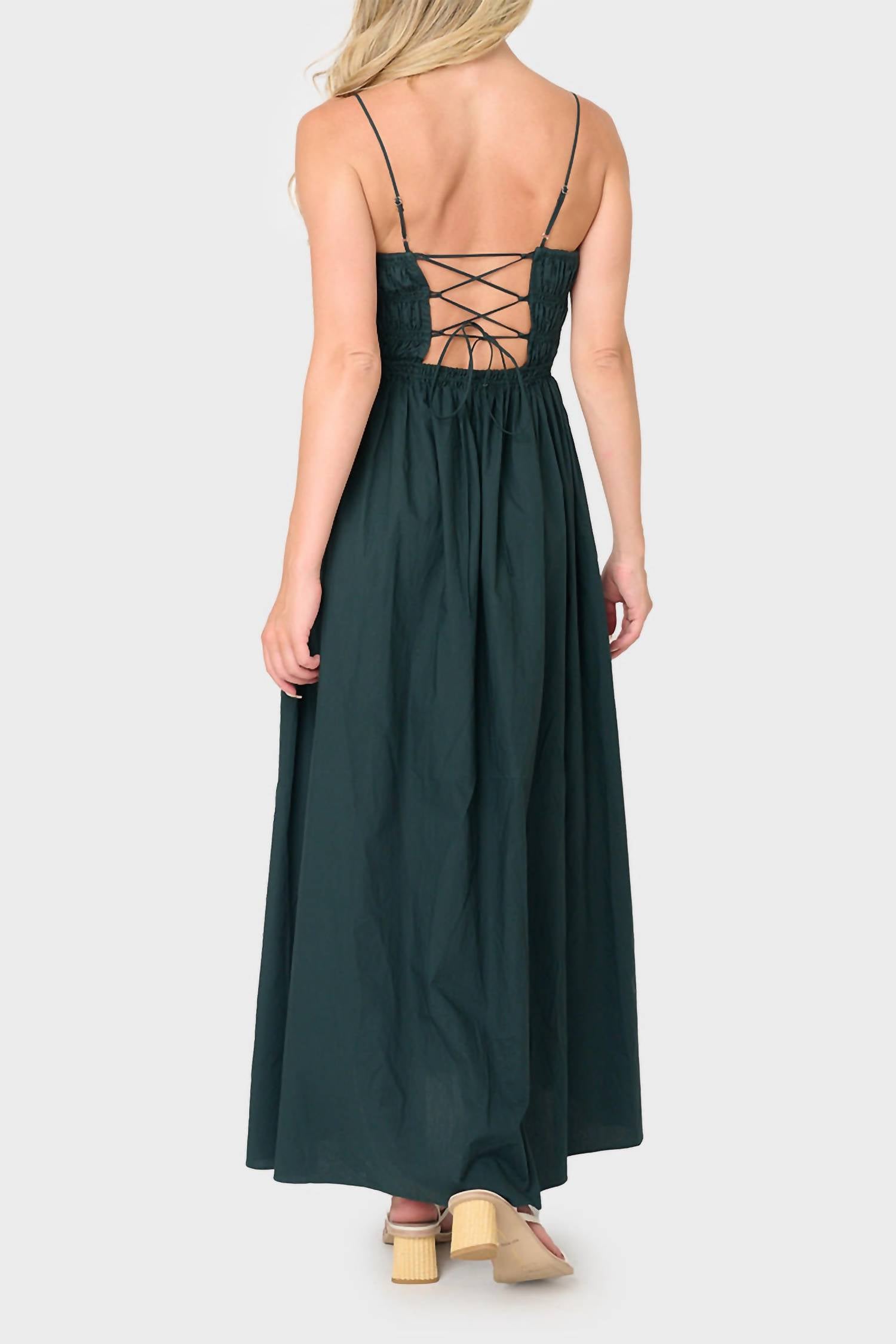 Just add slides or mules and you are good to go. Introducing the Sleeveless Square Neck Shirred Tie Back Midi Dress by MOON RIVER in a rich dark green hue, perfect for travel or summer occasions. This dress is meticulously crafted with a composition of 97% cotton and 3% elastane, offering an elegant and airy feel. The design features a square neck with a smocked bodice, a drapey gathered skirt, and a flattering 46 1/2" midi length in size Medium. Closure: Tie closure. Care: Delicate wash cycle, lay flat to dry. Model Jorgen is 5'5" and wearing a size XXS.