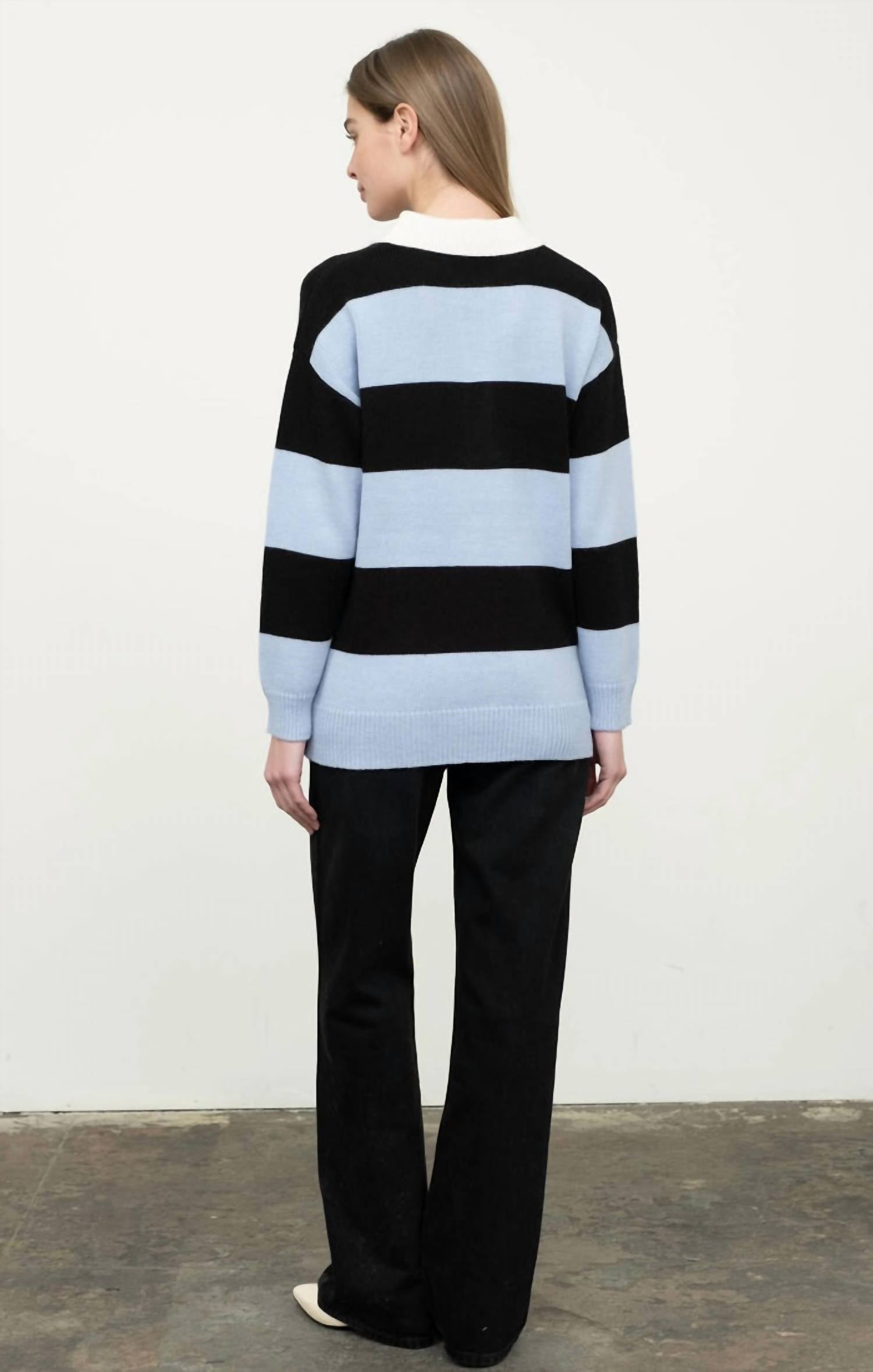 Great fit, cute design, soft fabric. You'll love everything about this long sleeve tee. Introducing the Tori Polo Sweater by Moon River, the perfect blend of preppy and relaxed style in a light blue multi-stripe pattern. This women's long sleeve sweater features a structured yet soft design with a polo neckline, ideal for both casual lounging and social outings. Crafted from 65% Acrylic, 20% Polyamide, and 15% Wool, it offers warmth and comfort suitable for the spring season. Closure: Button closure. Care: Hand wash.