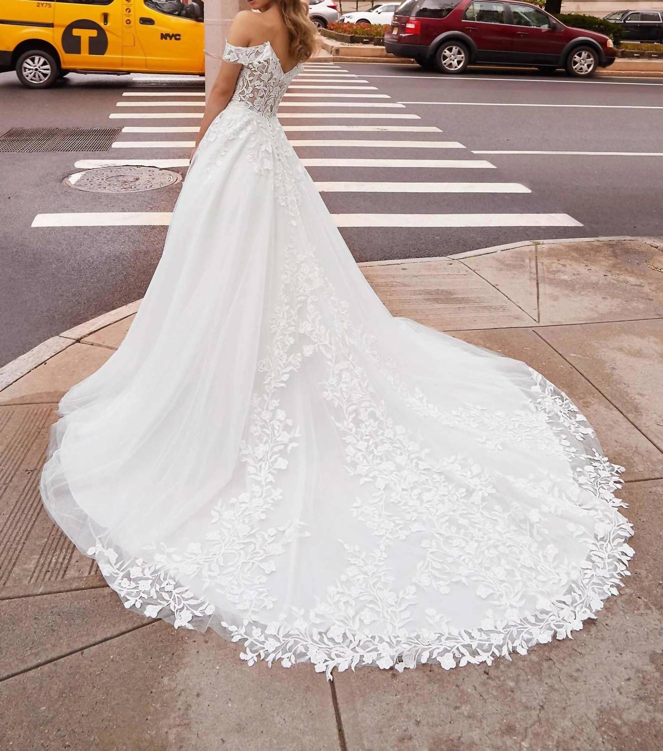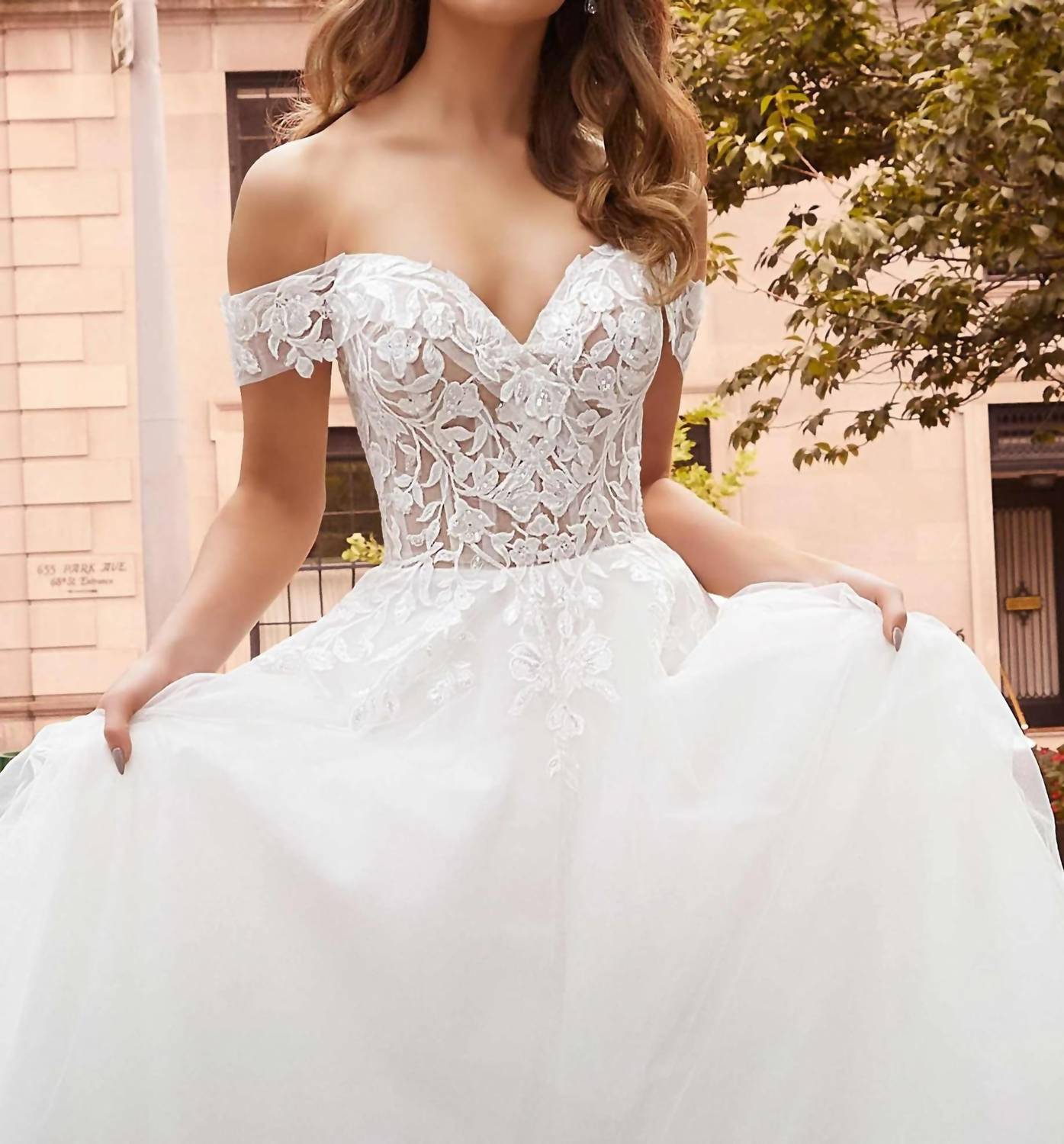 Designed for the bride who values understated elegance. Its classic design and perfect fit make it the ideal choice for your special day. Say yes to the dress! The Joaquina Gown by MORILEE is the epitome of elegance for any wedding occasion. Featuring a short sleeve, off-the-shoulder bodice with delicate frosted floral embroidery, this breathtaking ball gown exudes romance and sophistication. Crafted from airy tulle with intricate lace detailing, the A-line silhouette gracefully flows into a stunning lace-trimmed train. Button closure. Dry clean. This dress comes in Shades of Ivory, making it perfect for a minimalist bridal look.