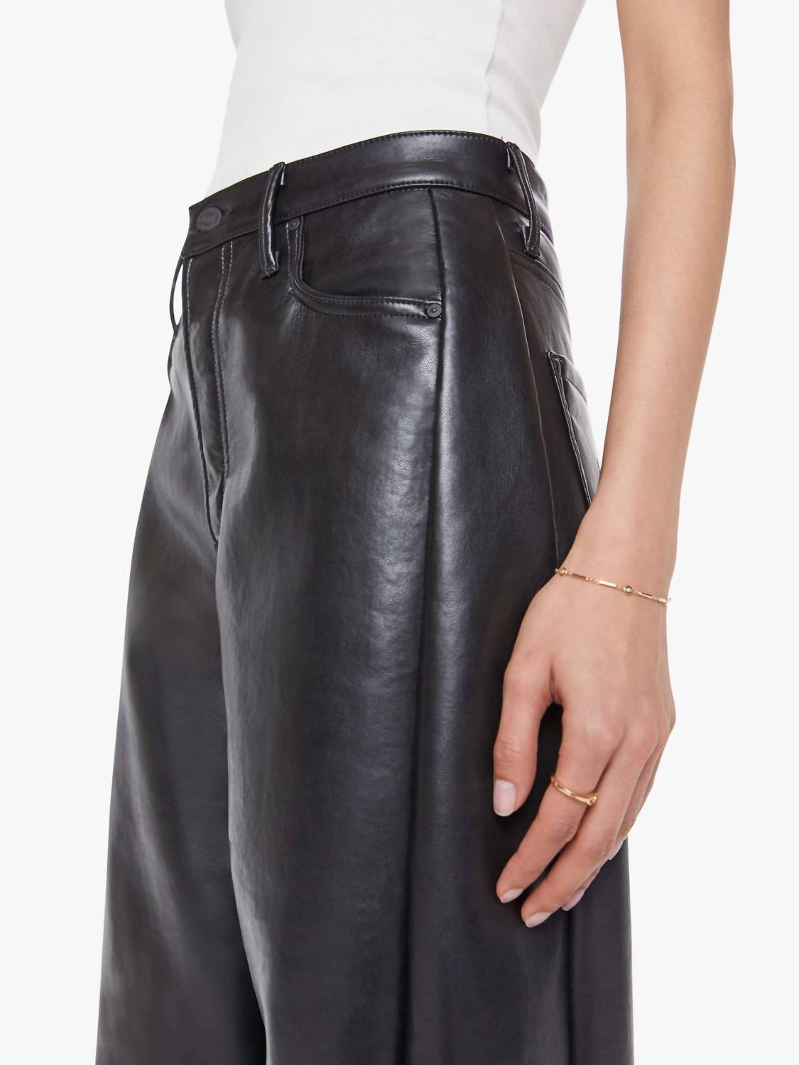 Meet the Half Pipe Flood High Waisted Pant by Mother, a chic streetwear piece designed for the modern woman. These super high-rise, wide-leg pants come in a relaxed fit with a flattering 12.5-inch rise and a 28.25-inch inseam. Crafted from a superior blend of 100% polyurethane-coated fabric with 60% recycled leather and 40% polyester backing, these black pants feature tonal hardware and a clean hem. Made in Los Angeles, they include practical pockets and a button closure, making them perfect for concerts or spring outfits. Care: Dry clean only. Model is 5'10" and wears size 26.