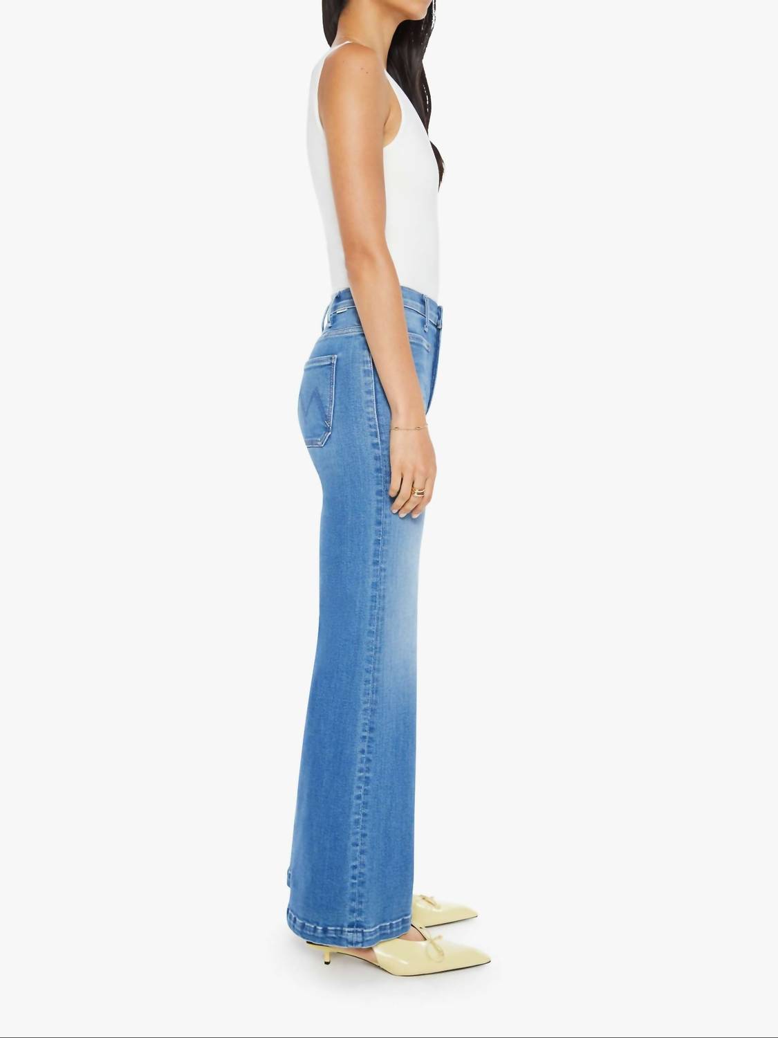 Just as cute as they are comfortable. Elevate your summer wardrobe with the Hustler Roller Patch Pocket Sneak Jean by Mother, a stylish throwback to 70s fashion. These wide leg jeans feature a high rise with patch pockets and a defined clean hem, ensuring both comfort and modern flair. Made in Los Angeles, they are crafted from a cotton blend consisting of 78% Cotton, 16% Modal, 4% Polyester, and 2% Elastane. For a sleek appearance, these jeans have a 30.75-inch inseam and a 24.5-inch leg opening, with care instructions calling for machine washing cold with like colors and a tumble dry low.
