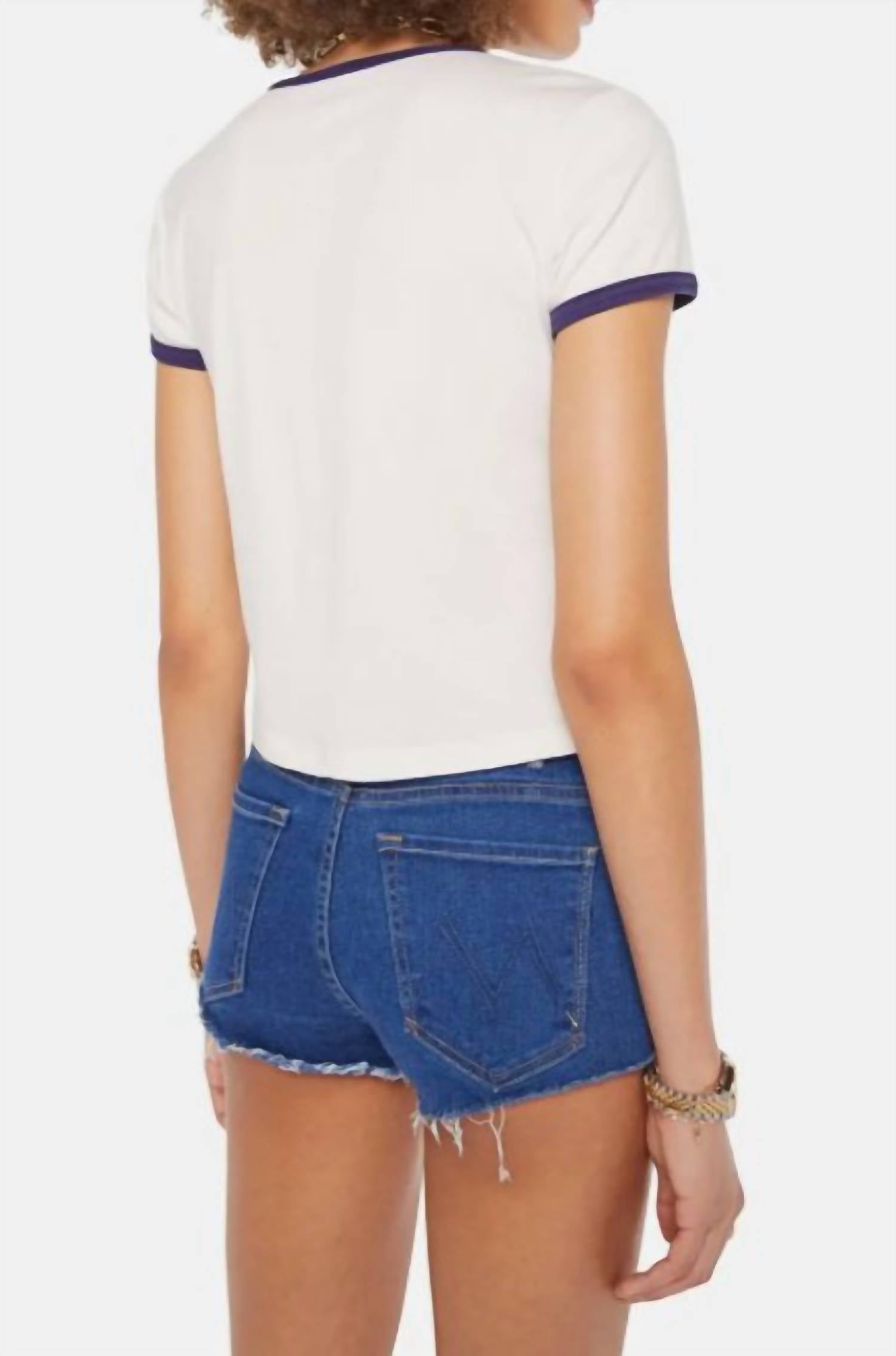 This classic, short sleeve tee will be your go-to staple this season and beyond. Embrace laid-back style with the Mother Itty Bitty Ringer Tee, a must-have in white with a nostalgic graphic design. This charming short sleeve shirt is crafted from 100% cotton, ensuring comfort and breathability for warm vacation days. Featuring a classic crewneck and a trendy 20-inch shrunken length, it is proudly made in the USA from imported fabric. Care is simple with machine wash and tumble dry instructions, making it a convenient addition to your wardrobe.