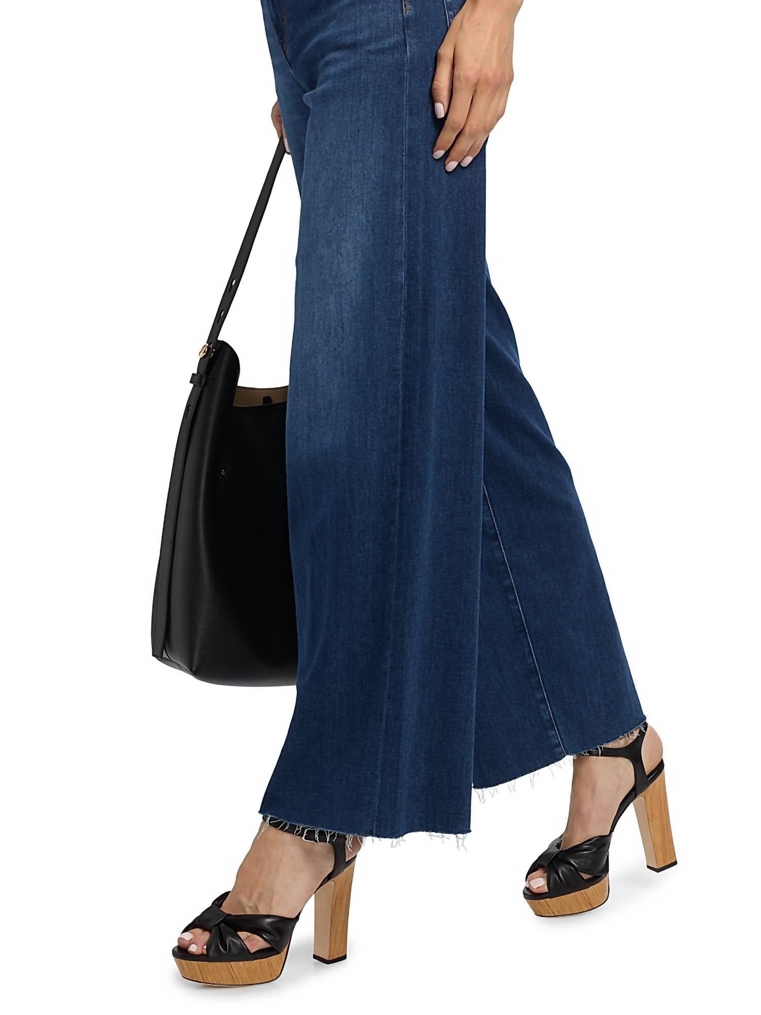 A flattering silhouette that's suprisingly versatile. Introducing the Le Slim Palazzo Jeans by Mother, the ultimate wardrobe staple for stylish travel. These high-rise jeans in 'Celebrity Raw After' feature a relaxed fit with a wide-leg silhouette, measuring an inseam of about 31 inches and a leg opening of about 22.5 inches. Crafted from a solid stretch cotton-blend denim with 79% cotton, 15% lyocell, 4% elasterell-p, and 2% elastane, they boast a comfortable fit with a zip fly and button closure. Perfect for Y2K trends this spring, these jeans are machine washable and can be tumble dried.