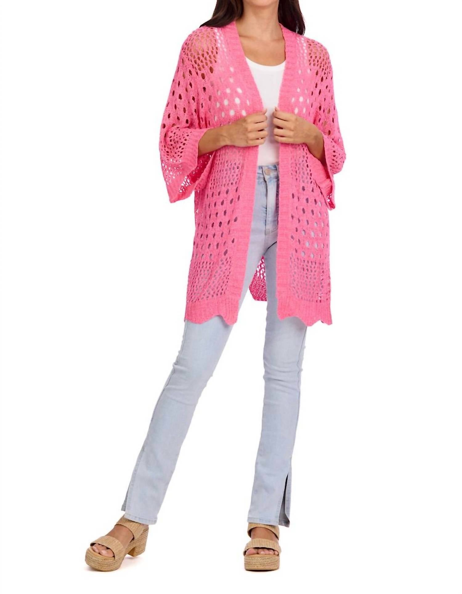 This cardigan will be a sweater-rotation favorite. The Jeanie Crochet Cardigan by Mudpie in vibrant Hot Pink is an eye-catching addition to any wardrobe. This long sleeve cardigan features a V-neck design with an open front and a textured, ribboned knit with scalloped edges, embodying a Boho Chic trend perfect for spring. It measures approximately 30" from shoulder to hem and is crafted from cozy acrylic material. Closure: Pull-on style.