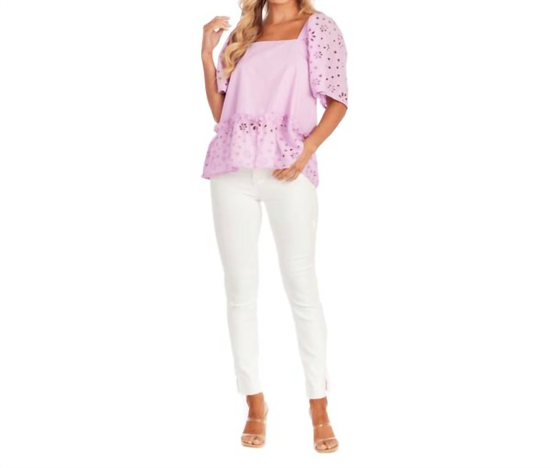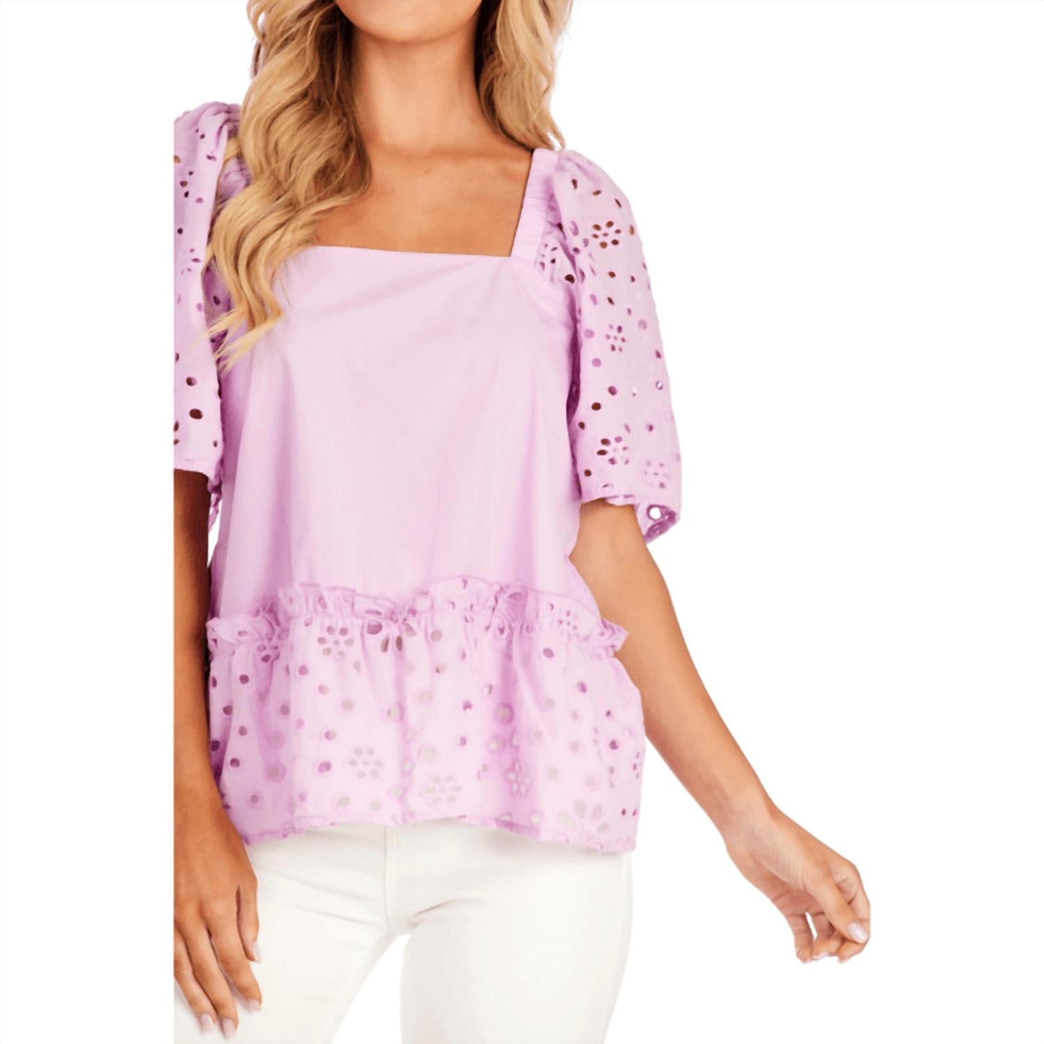 A versatile blouse that works from desk to dinner! Elevate your wardrobe with the Kieran Lavender Eyelet Top by Mudpie, a chic poplin blouse designed for the fashion-forward woman. This top features delicate eyelet sleeves and a flounce hem with an exposed ruffle seam, measuring approximately 25 inches from shoulder to hem, highlighting its feminine charm. Material: 100% Cotton for both shell and lining, ensuring comfort and breathability. Care: Machine wash cold with like colors, use non-chlorine bleach when needed, and line dry; a cool iron may be used to maintain a polished look.
