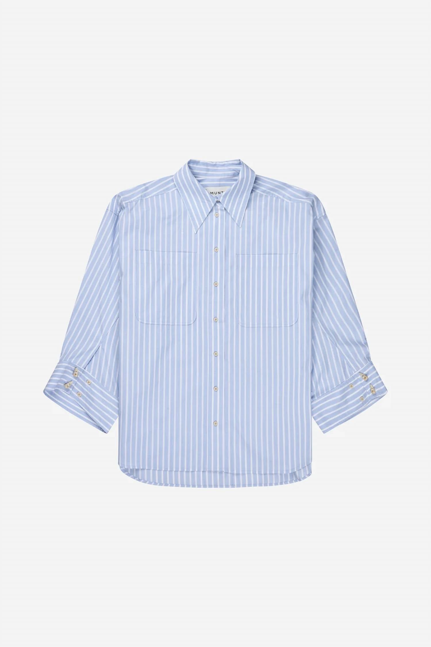 Perfectly tailored and soft to the touch. MUNTHE presents the Lynne Stripe Buttons Shirt, a light blue statement piece for your spring vacation wardrobe. This oversized, long sleeve shirt features elegant stripes and wide stylish cuffs, complete with beautiful faux horn buttons. Expertly crafted from cotton, it offers both comfort and a preppy flair.
