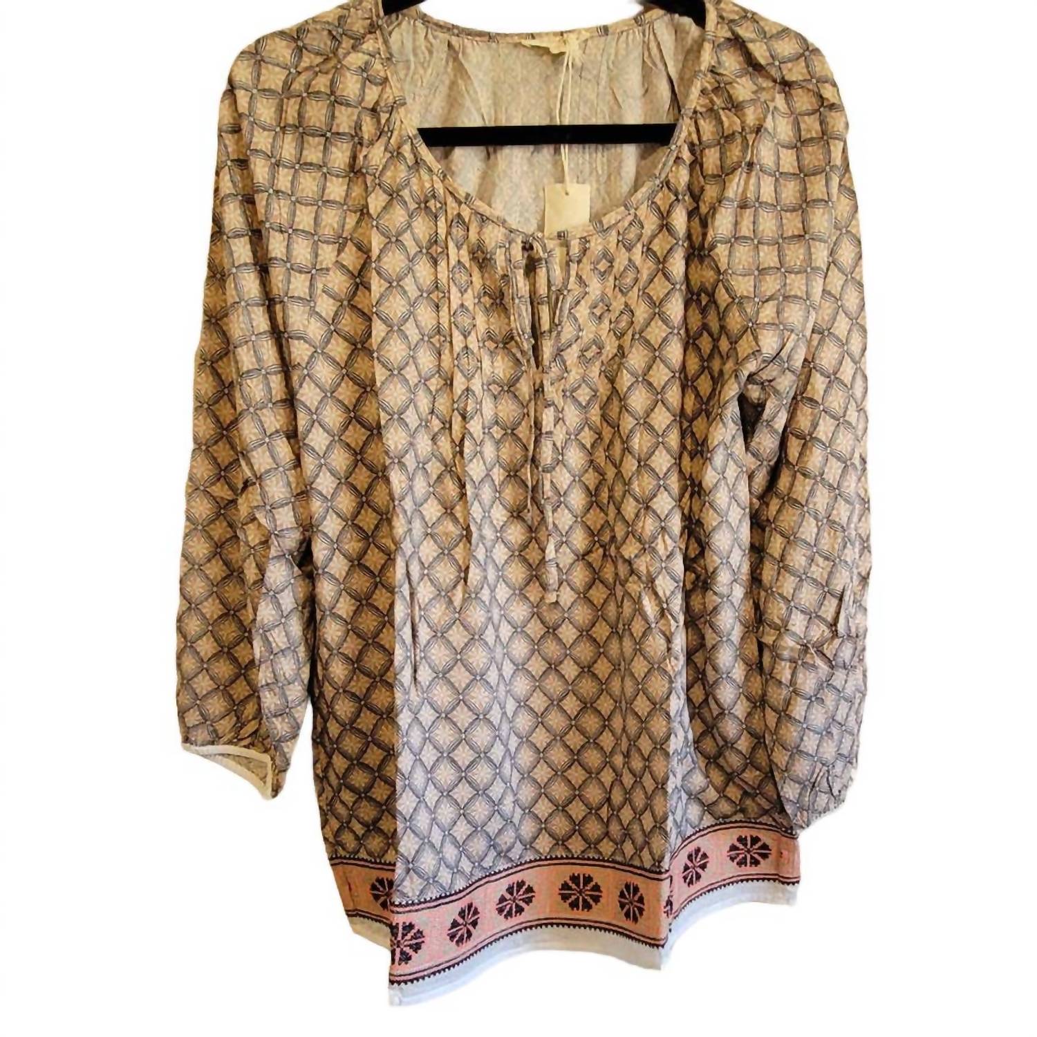 A perfect addition to any wardrobe, this classic tunic style blouse is flattering and effortless. You can easily transition from desk to dinner in this chic top. Elevate your boho chic wardrobe with the Mystree Boho Embroidered Border Tunic Top, designed for effortless style. This women's tunic features three-quarter gathered sleeves and a playful patterned design in coral, cream, tan, and black. Made from 100% Rayon, it sports a flattering scoop neckline with a convenient pull-on closure. Measuring 19" across the bust and 24.5" in length, it's an ideal choice for a summer dinner party or casual outing.