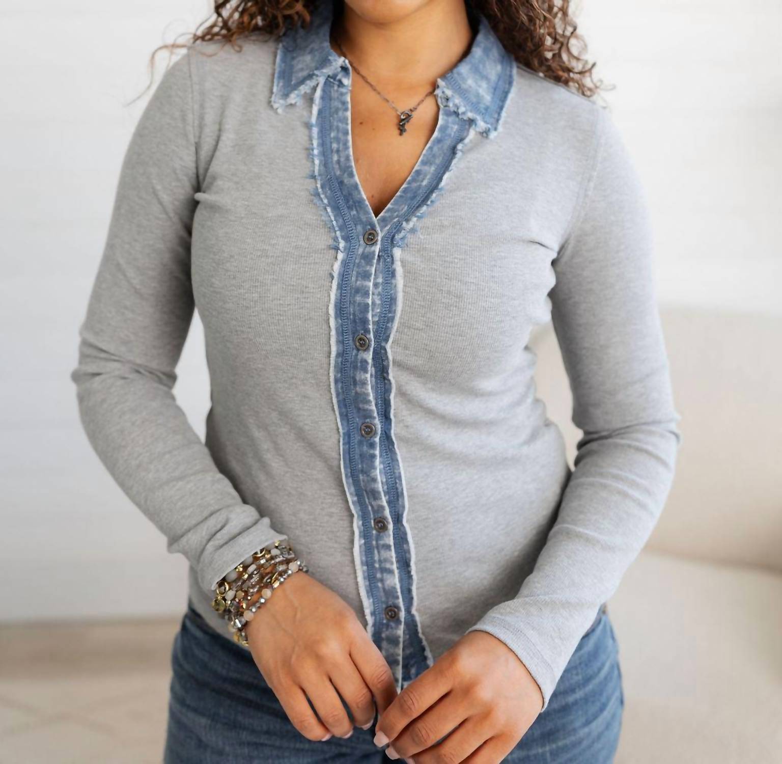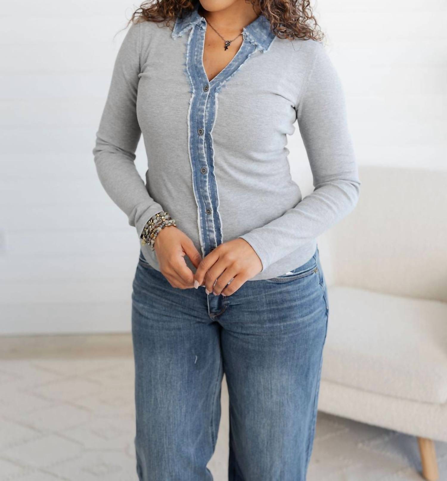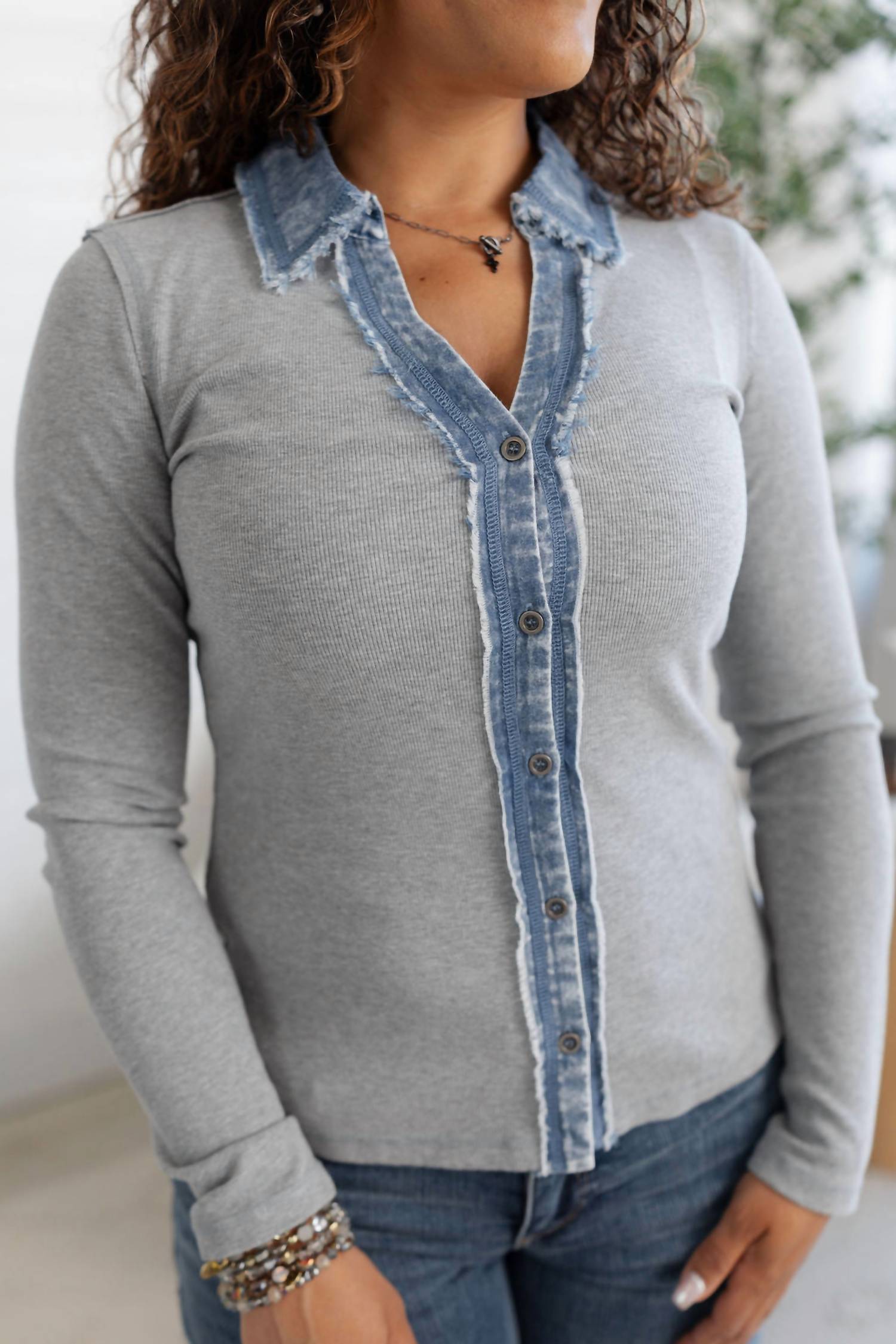 A timeless blouse that will never go out of style. Introduce warmth and style to your wardrobe with the Collared Washed Thermal Button Down Top by Mystree. This women's blouse, in a chic grey, features long sleeves and a solid pattern that make it an ideal choice for a minimalist spring look. Crafted from a comfortable cotton blend with a unique washed denim trim, it offers a soft thermal fabric composition of 95% Cotton, 5% Spandex, and 100% Tencel contrast. The top ensures a neat and classic silhouette with its button closure and collared neckline, perfect for a dinner party occasion.