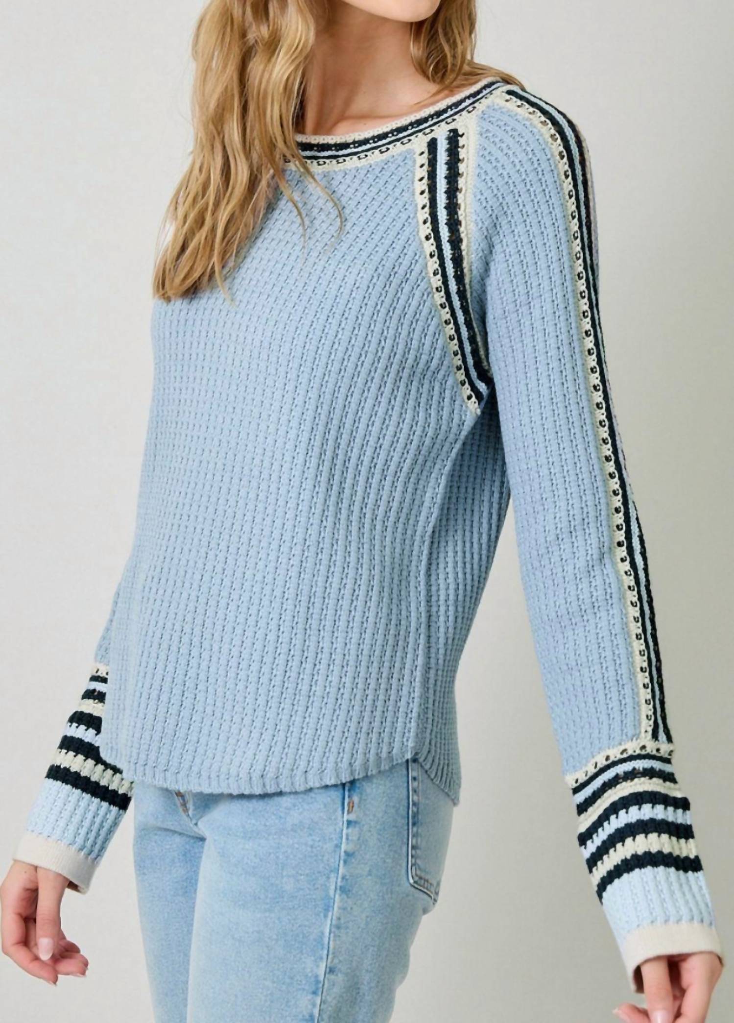 Stay warm and stylish in this versatile and effortlessly cool knitwear staple. Wear it alone or layered, it's the perfect sweater for the season and you'll wish you had it in every color. Introducing the Raglan Sleeve Trim Detail Sweater by Mystree in a sophisticated Soft Blue hue, perfect for a minimalist autumn look. This stylish women’s sweater features long raglan sleeves and a textured cotton blend composition of 55% acrylic and 45% cotton. Designed with a classic crew neck, it offers effortless elegance with its simple pull-on closure. Ideal for a holiday party.