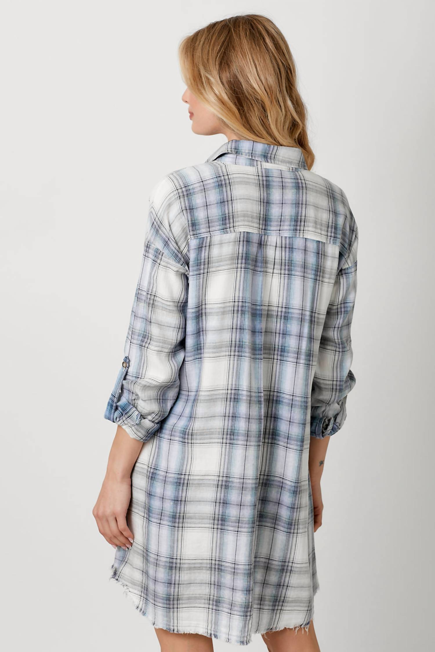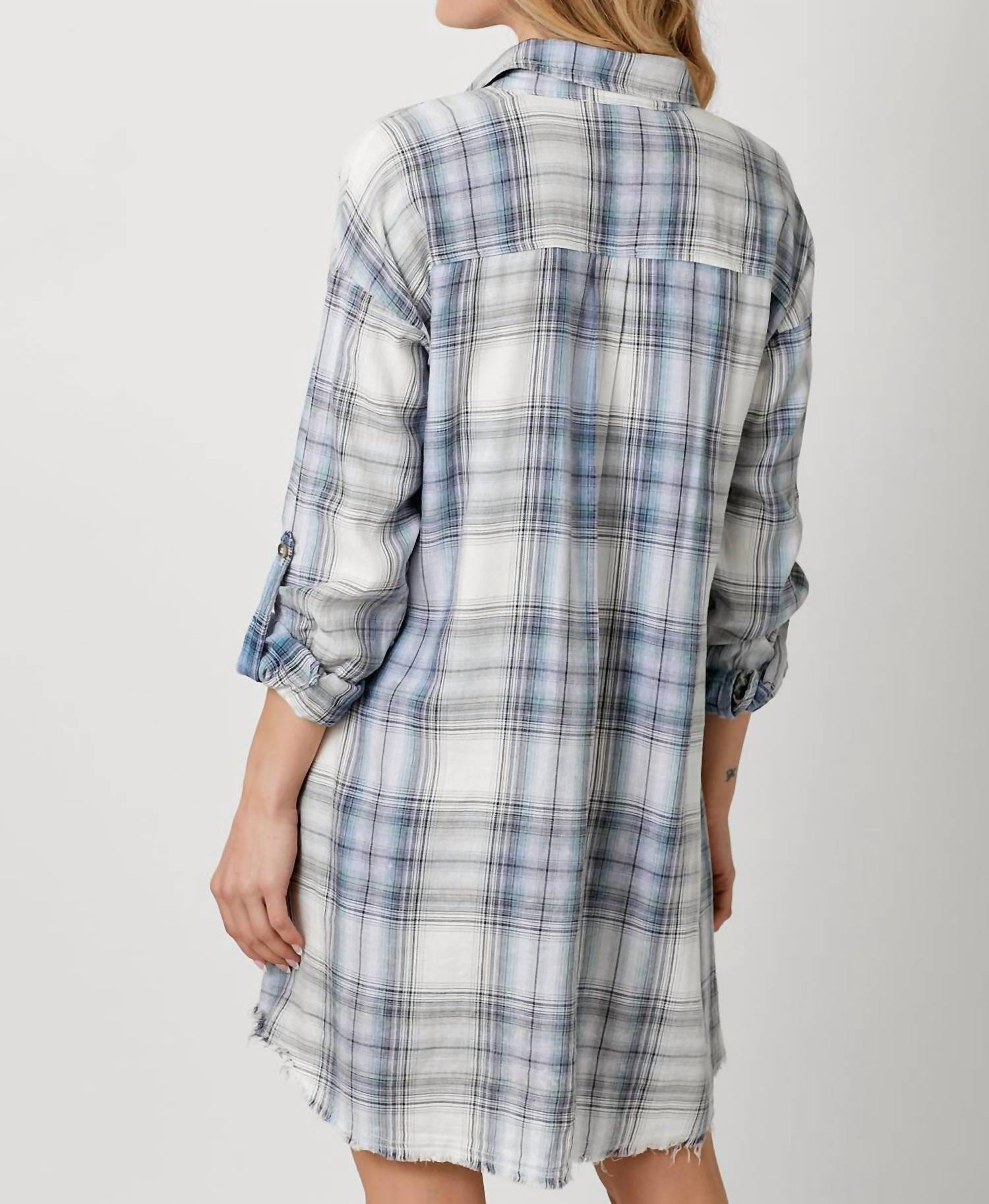 The kind of easy and flattering dress you'll be reaching for all season long. Step out in style with the Mystree Rolled Up Sleeve Washed Plaid Mini Dress, perfect for any summer occasion. This women's plaid and check shirt dress features three-quarter rolled-up sleeves for a casual yet sophisticated look. Crafted from 80% Cotton, 20% Polyester, it includes convenient pockets and a pull-on closure for easy wear. Care for it effortlessly with machine wash and tumble dry instructions.