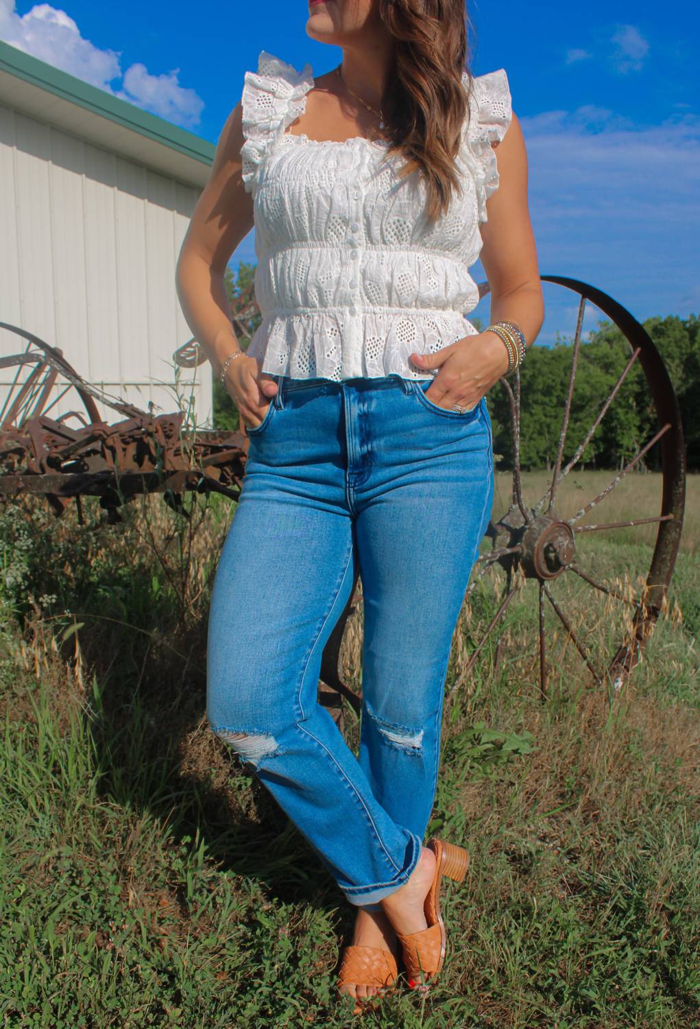 Fit, fabric and functionality. This tank top checks all the boxes. Introducing the Ruffle Shoulder Ruched Tank Top by Mystree, a chic and versatile option for any minimalist wardrobe. This sleeveless top, crafted from a breathable 100% cotton shell with a lining of 95% nylon and 5% spandex, features a stylish square neckline and an eye-catching eyelet design throughout. Its button closure enhances its elegant aesthetic, perfect for special occasions like a baby shower or Easter. Care is made easy with machine wash instructions. Model is wearing a size S and stands 5'9".