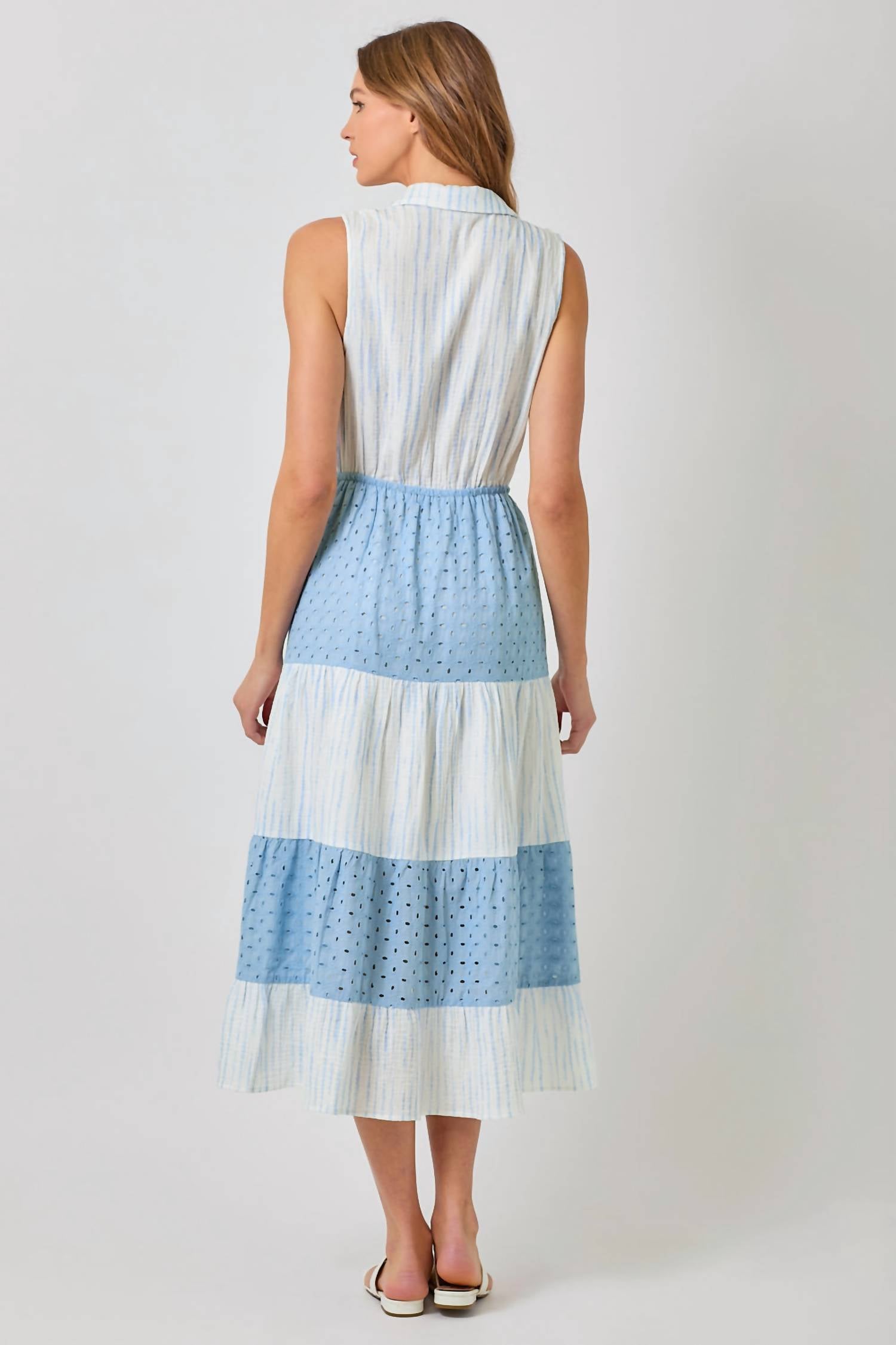 A maxi dress that is just as cute as it is comfortable. Embrace boho chic with the Sleeveless Maxi Dress by Mystree, perfect for a Beach Day in its striking Blue & White stripe pattern. This cotton A-line dress features a tie front and a cinched stretch waist for a flattering fit, with a tiered ruffle bottom adding playful movement. The midi-length garment boasts a classic collared V-neckline and a tie closure. Ideal for summer escapades, experience the breezy comfort and stylish elegance of this piece.