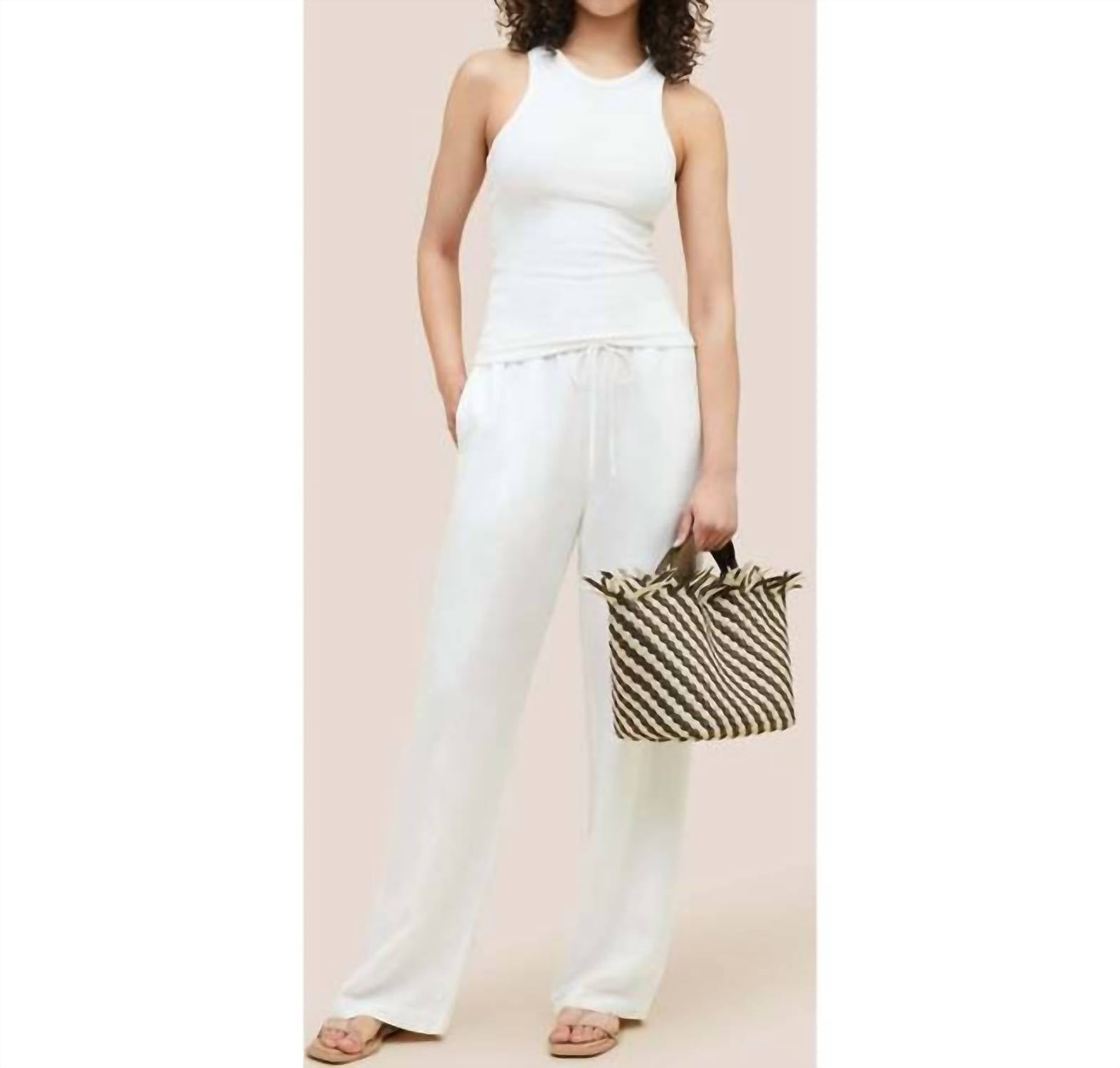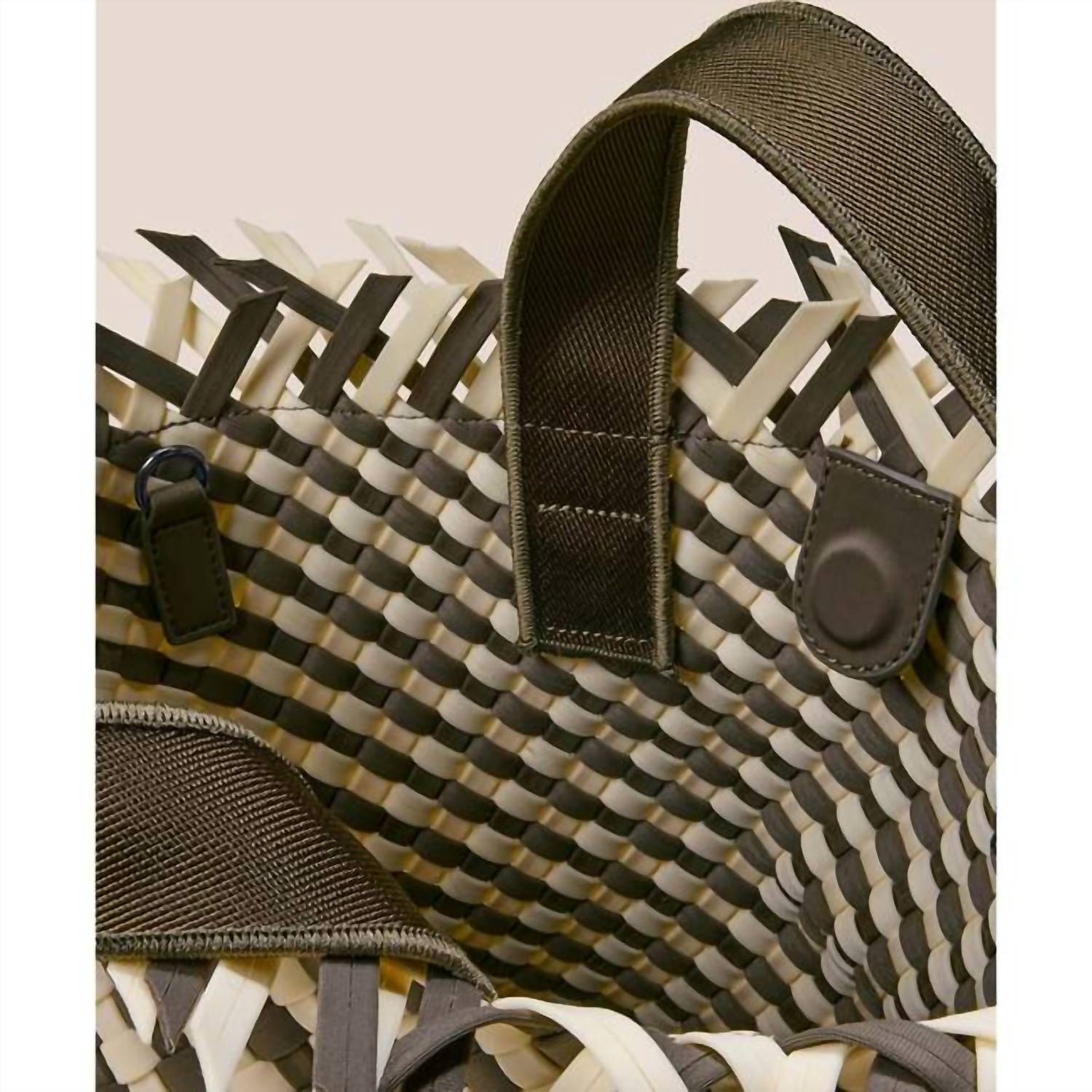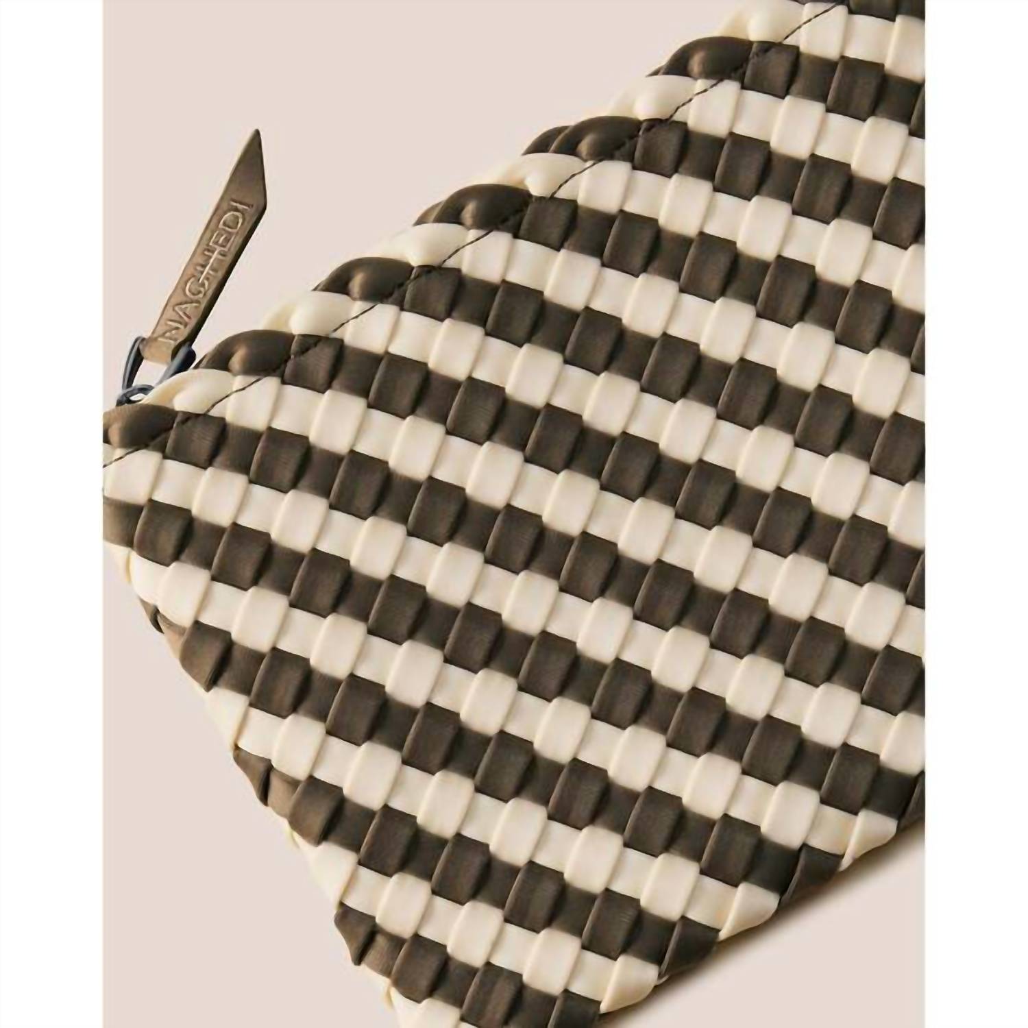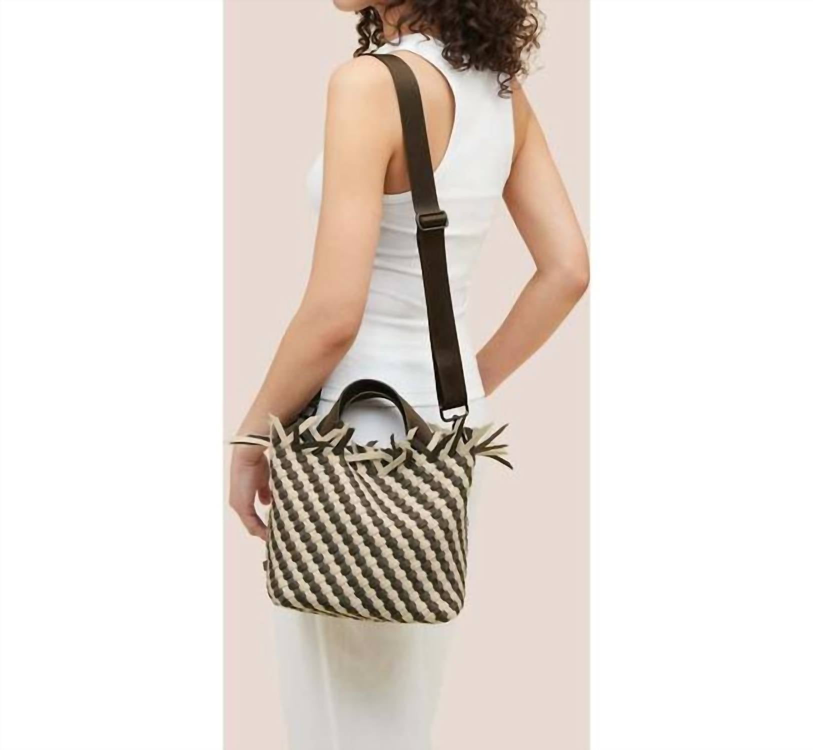 The perfect throw-it-in-and-go bag for your next weekend away or beach vacation! Its classic design will never go out of style and you'll be reaching for this bag season after season. Introducing the Havana Striped Tote Bag - Small by Naghedi, a stylish addition to your accessory collection inspired by Mediterranean beach motifs. Crafted in China from handwoven neoprene, this tote comes in a Taupe/Cream color with textural fringe finishing. Featuring an open top with a magnetic snap closure and Terre nylon handles, it includes a detachable, adjustable crossbody strap and a matching woven zippered pouch. Dimensions are 8.5" in height, 14" in width, and 7" in depth, with a handle drop of 6".