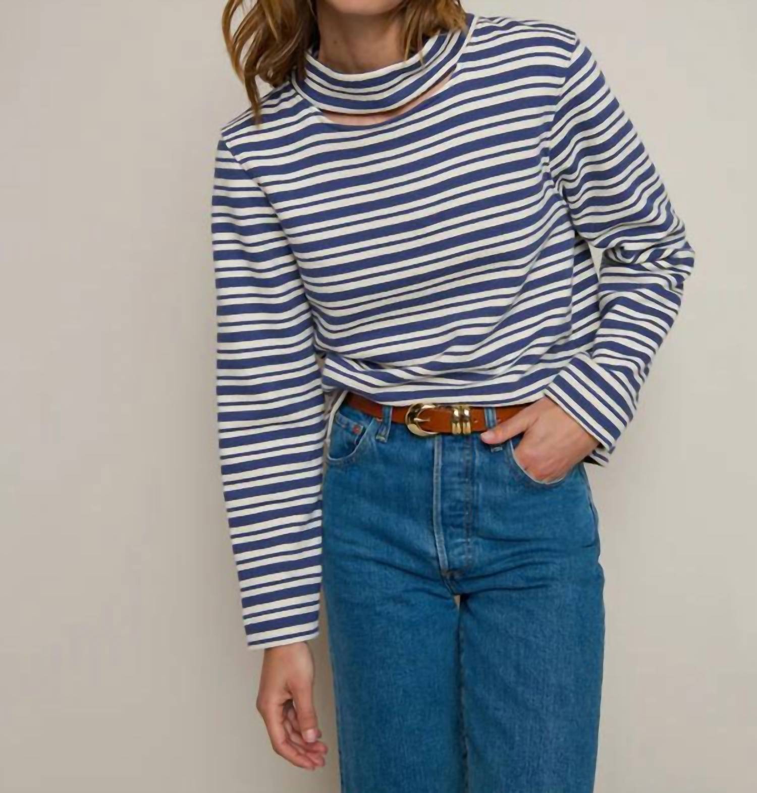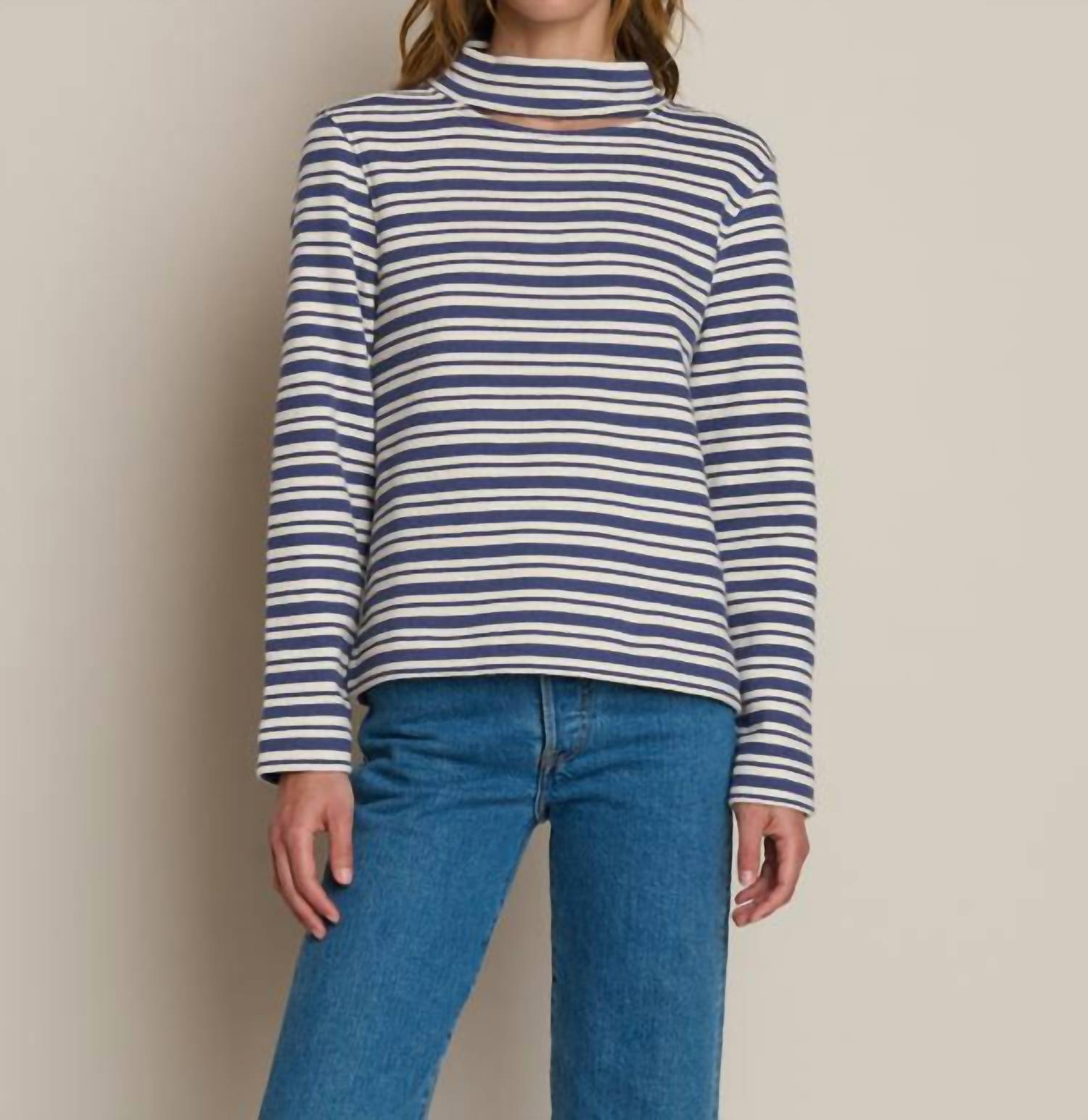 Cozy fabric, impeccable design - Meet the sweatshirt that you'll never want to take off. Elevate your casual wardrobe with the Delphine Sweatshirt by Nation LTD, featuring a chic Tossed Stripe design. This long sleeve top is crafted from 100% cotton in heavyweight knit with a garment length of 23.5 inches, made in Portugal. It boasts a unique cut-out below the mock neck, perfect for adding a subtle touch to your look, and offers easy pull-on closure. Designed for practicality, it is machine washable; simply air dry or use a low setting to maintain its shape.