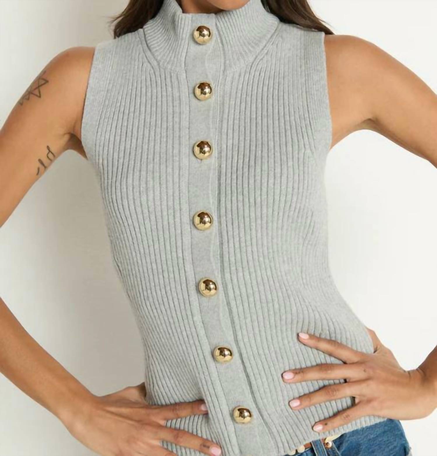 Throw this vest over an all black outfit for a perfectly polished look. Introducing the Ira Sweater Vest by Nation LTD, a stylish piece designed for minimalist elegance in Heather Gray. This sleeveless vest boasts a mock neck and luxurious ribbing, complemented by textured patterning and gold dome buttons. Made from a plush cotton blend, it lands gracefully at the hip, making it an ideal addition to any spring wardrobe. Closure: Button closure. Care instructions include hand washing and laying flat to dry.