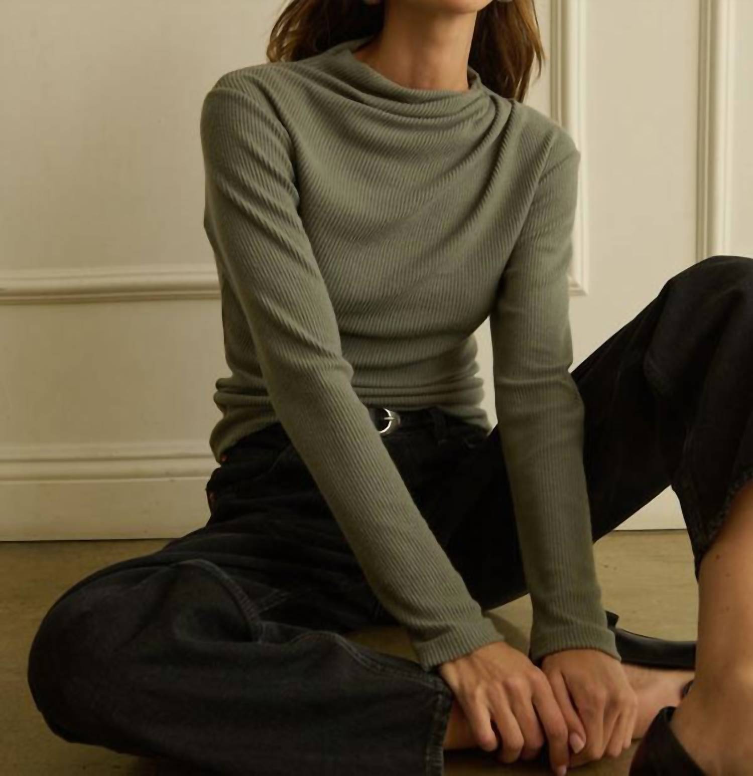 The perfect long sleeve tee that goes with just about anything. Elevate your fall wardrobe with the Neda Pleated Top by Nation LTD, a minimalist long sleeve essential in Castor Grey. Crafted from a heavyweight rib material composed of 48% Recycled Polyester, 48% Tencel Modal, and 4% Elastane, this top offers high stretch and a smooth drape, perfect for a polished look. Made in Peru, its pull-on closure and mockneck design make it an ideal choice for holiday parties. Care for this garment by washing less frequently, machine washing inside out to maintain shape, and line drying to prevent shrinking.