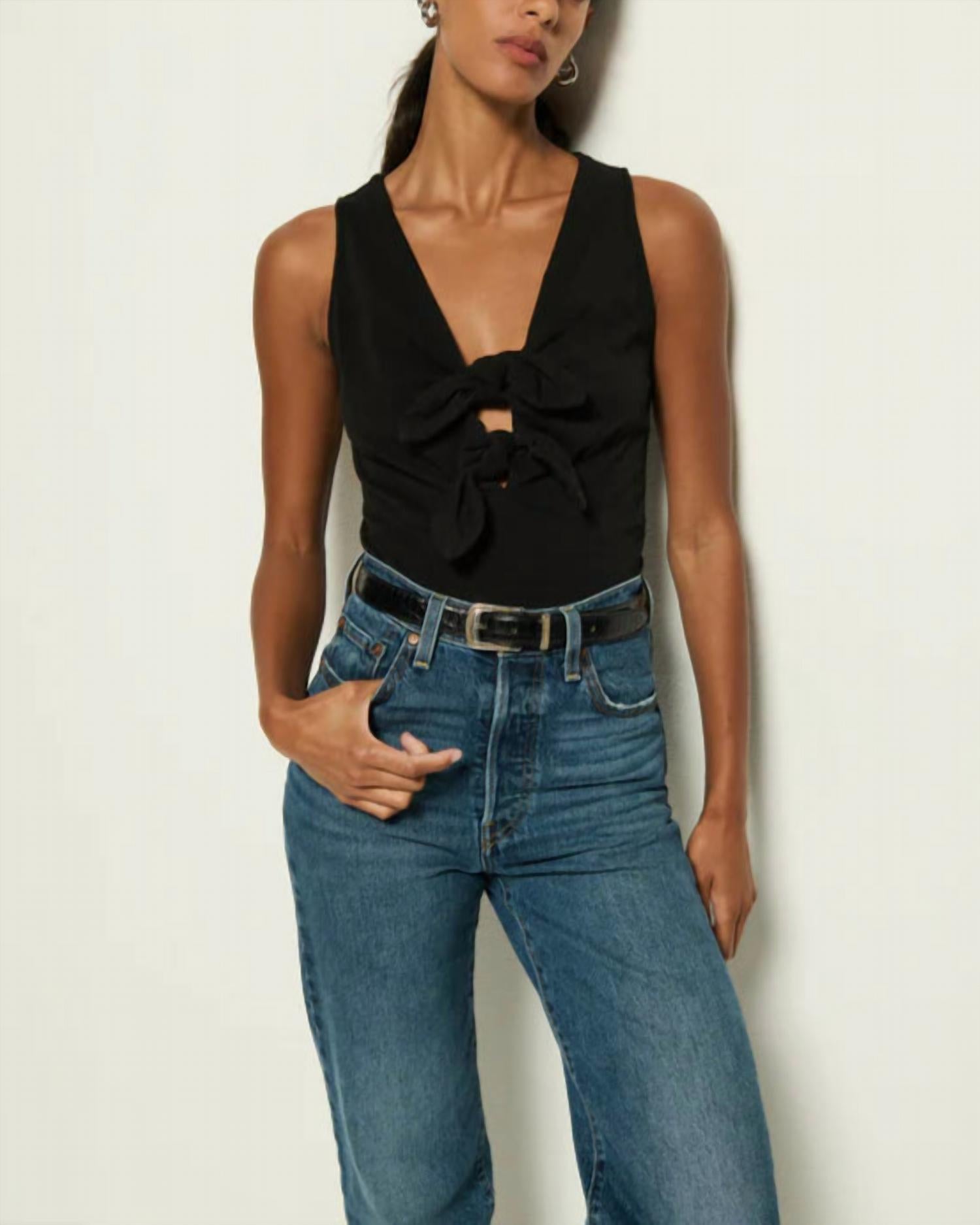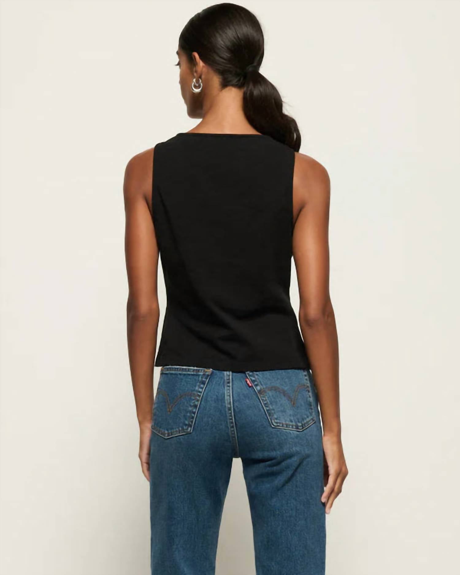 This classic tank top is perfect for layering and cute enough to wear on its own. When in need of a refined going-out top, the Terri Tie Tank by Nation LTD steps in with elegance. This sleeveless tank, crafted from 100% heavyweight Peruvian cotton, features a sophisticated v-neckline and self tie closure that blends style and comfort in jet black. Made in Peru, the tank ensures a flattering fit with its stretch cotton jersey and side slit openings. For longevity, machine wash and line dry to maintain its delightful appearance while avoiding abrasion against items like denim or those with hardware.