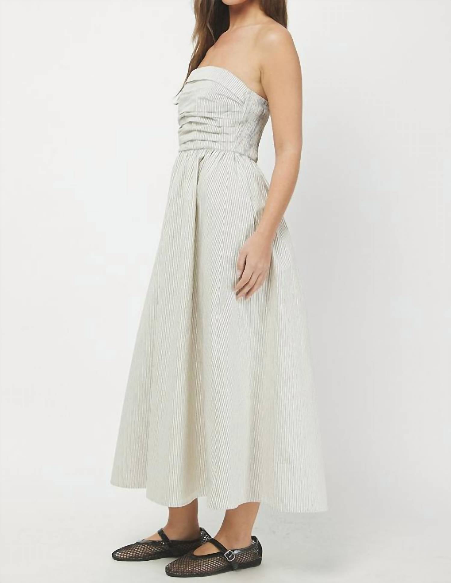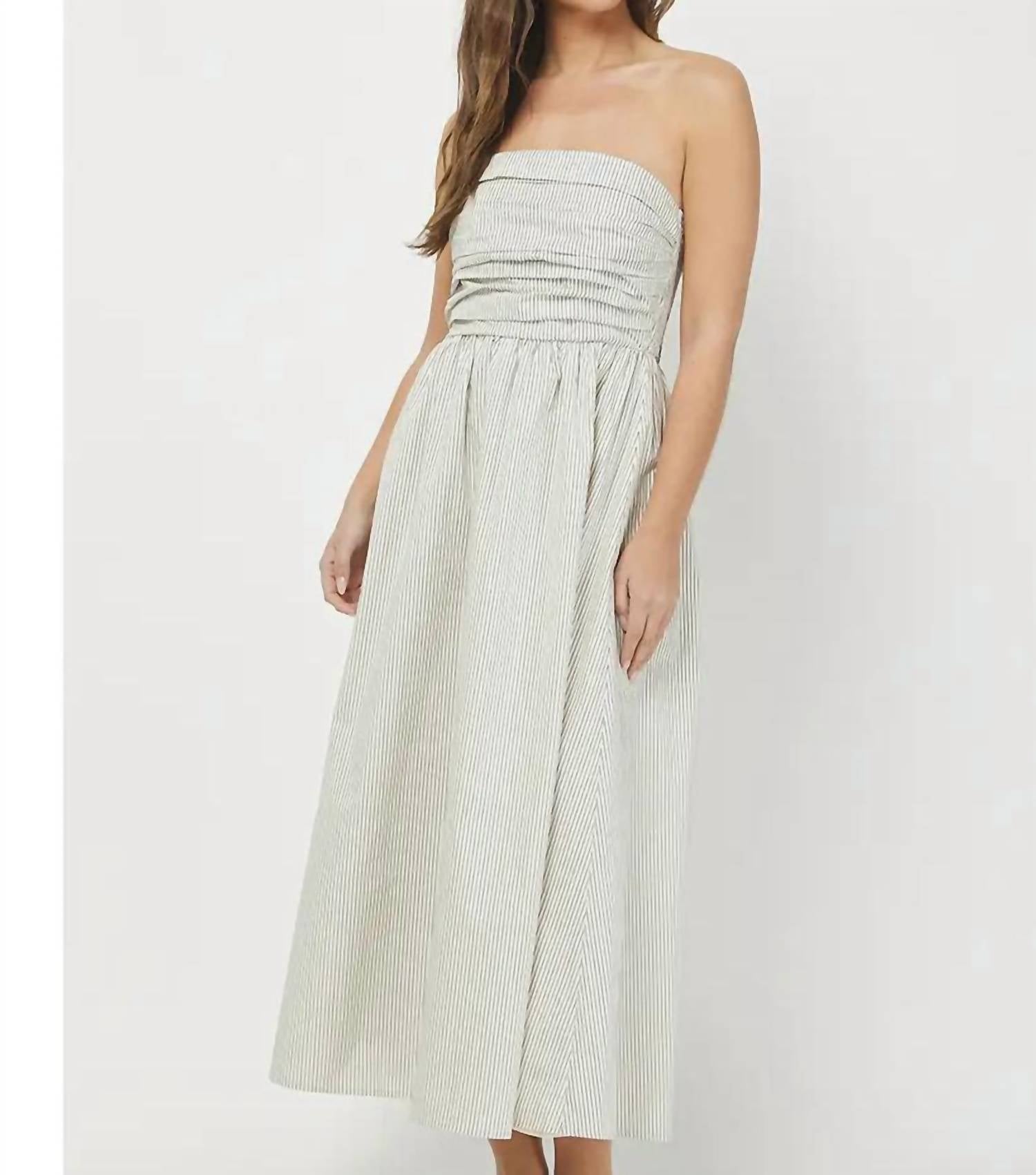 A maxi dress that is just as cute as it is comfortable. Introducing the Annabelle Tube Maxi Dress by needii, a timeless piece designed for effortless elegance in taupe. This strapless dress features a flattering A-line silhouette crafted in soft, breathable 100% cotton with an elastic ruched back for comfort. The flowy maxi-length skirt is fully lined with 95% polyester and 5% spandex to ensure a perfect fit, while the subtle stripe pattern adds a touch of sophistication. Closure: Pull-on.