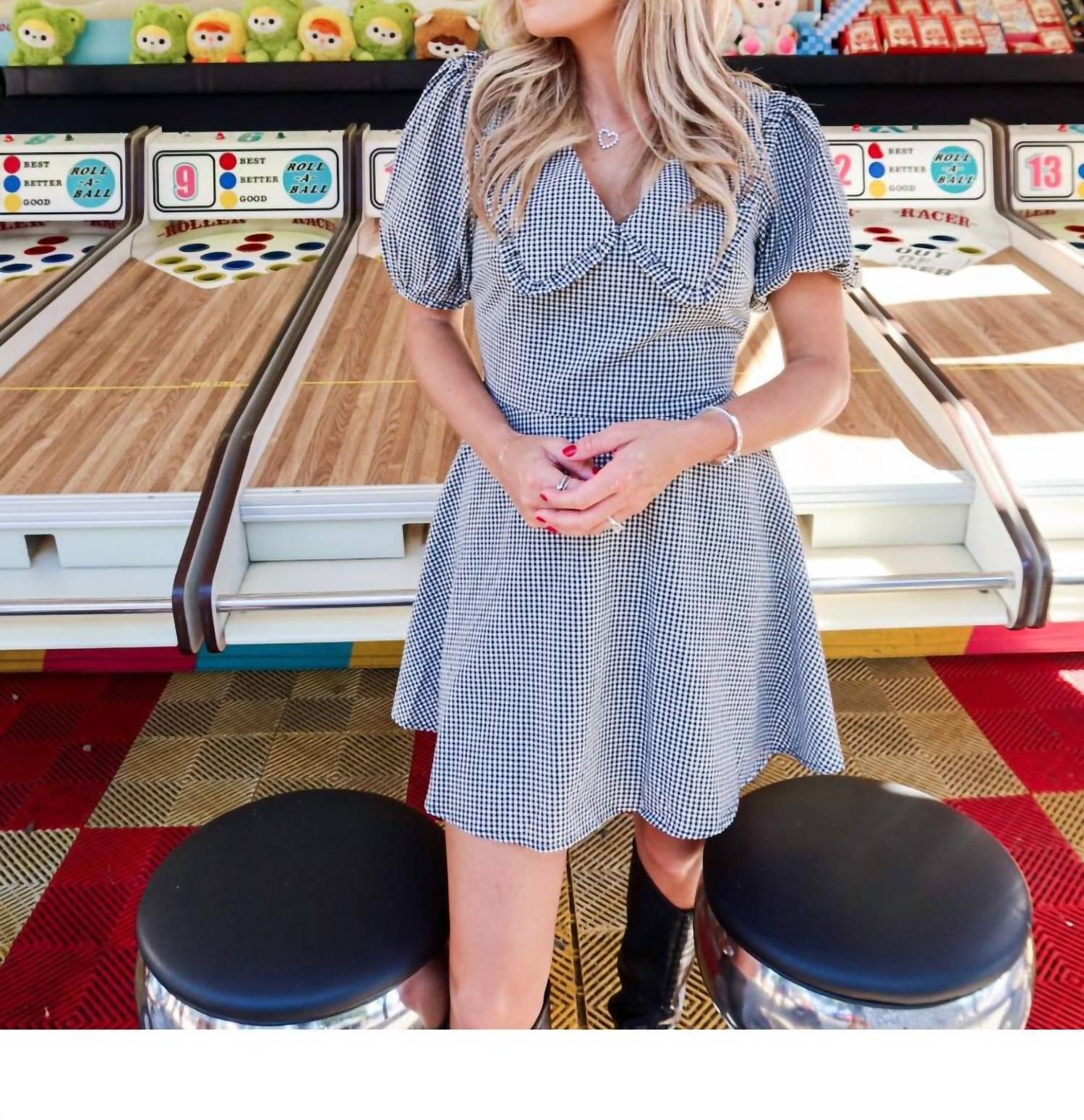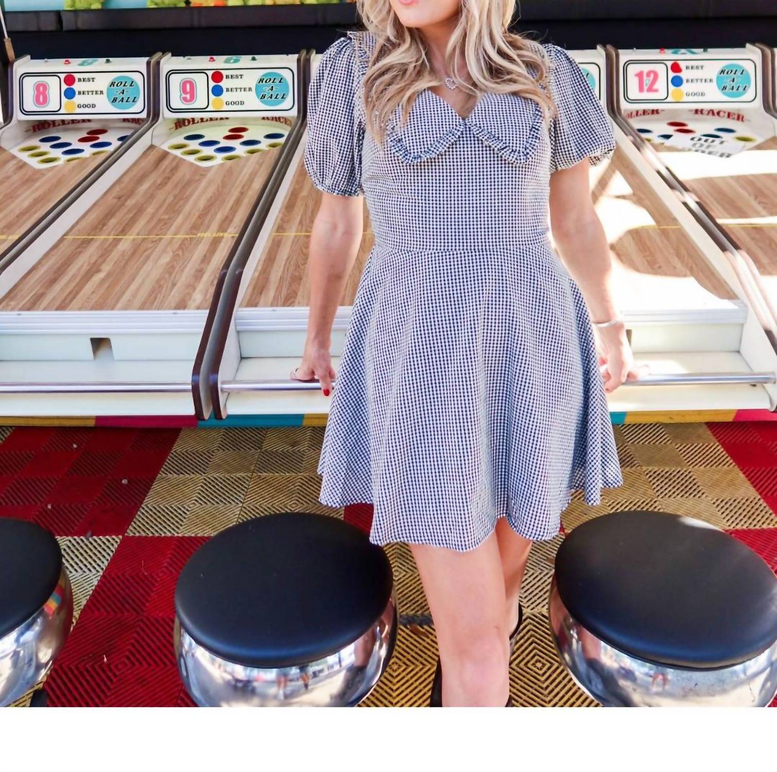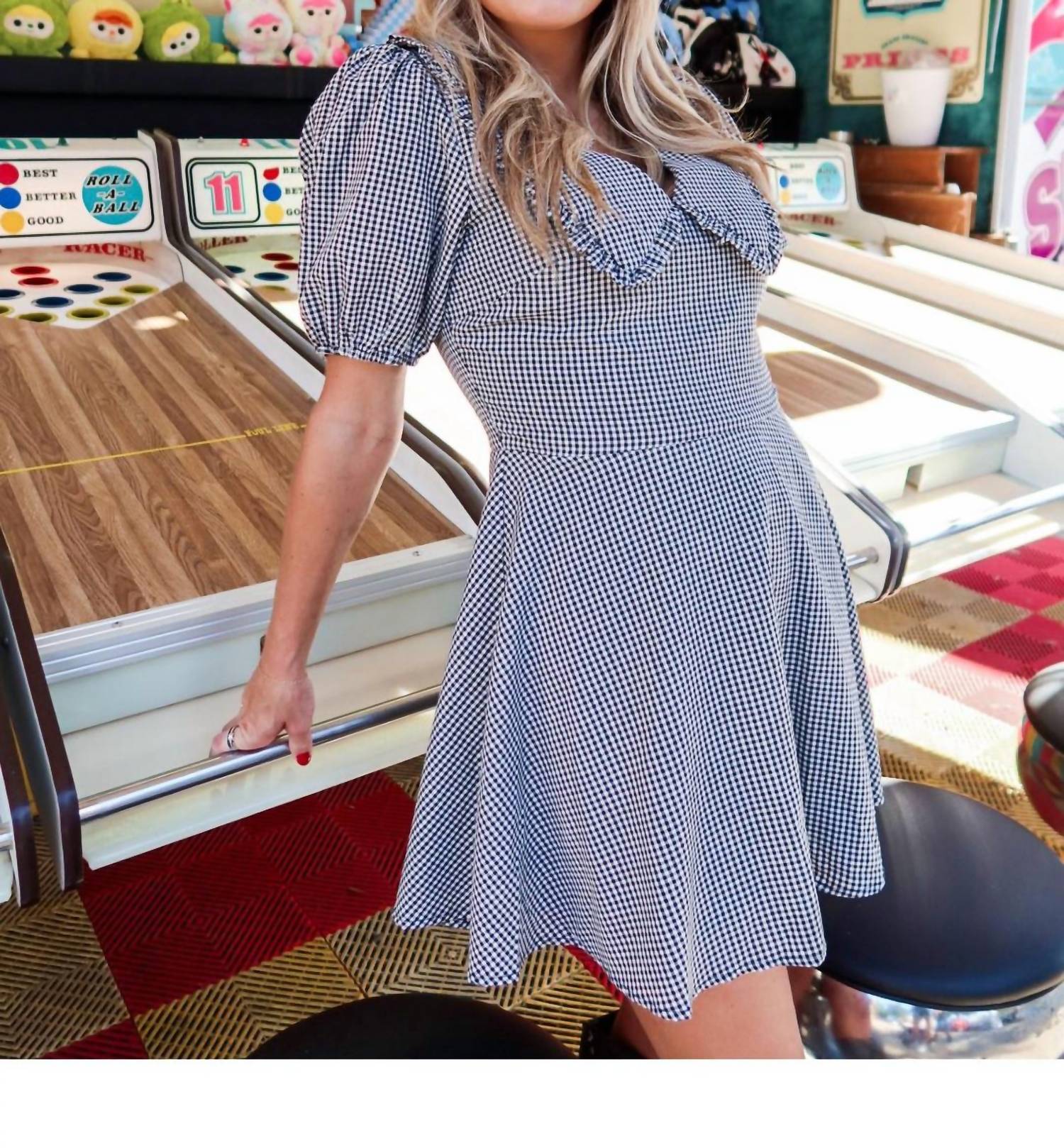 A short and breezy dress for those warmer days. Step into playful elegance with the Check Me Out Mini Dress by needii, a chic addition to your wardrobe. Featuring short sleeves and crafted from polyester, this mini dress showcases a bold black and white checkered print with an oversized ruffle collar for added drama. Designed to be lightweight and easy to layer, it's perfect for holiday parties or any summer outing. Closure: Zip closure. Care: Hand wash, line dry. Taylor is 5’5” and wearing size S.