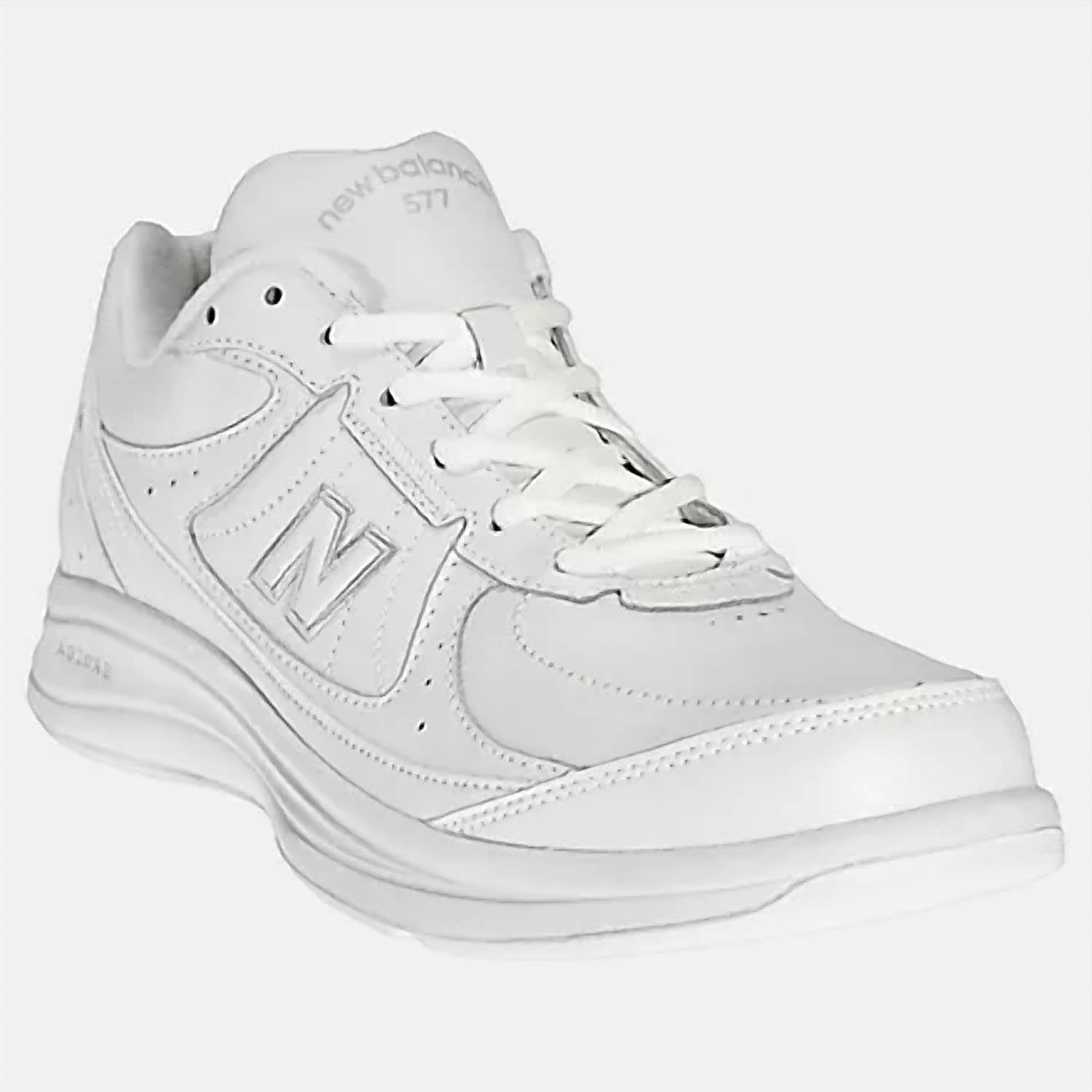The New Balance Men's Mw577 Shoes in classic white offer the ultimate support for those constantly on the move. Crafted with a leather upper and featuring Abzorb® cushioning in the heel, they ensure exceptional shock absorption and foot comfort. Built with a durable solid rubber outsole and reinforced with a polyurethane midsole for stable cushioning, these shoes are designed with reflective accents to increase visibility. Proudly assembled in the USA, they weigh 385 grams (13.6 oz) and may be eligible for Medicare reimbursement with styles like MW577WT, MW577BK, and others.