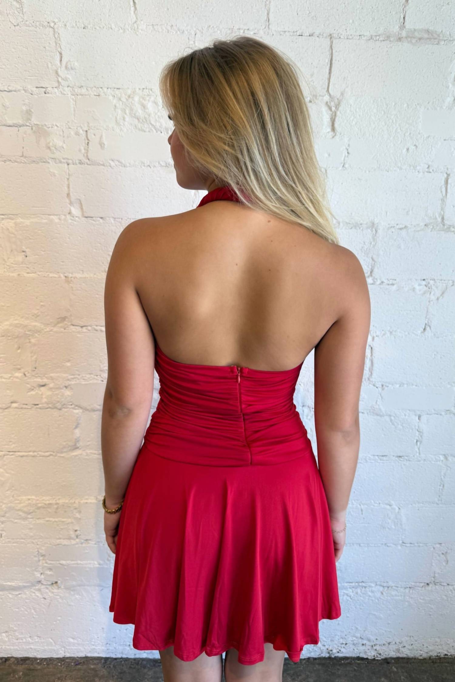 The kind of easy and flattering dress you'll be reaching for all season long. Introducing the NIA Bailey Mini Dress, a vibrant red piece that effortlessly merges timeless elegance with a modern design. This sleeveless dress features a chic halter neckline and a flattering fit-and-flare silhouette, perfect for standing out at any event. Crafted from a blend of 95% polyester and 5% spandex, it includes a convenient zip closure. Care instructions recommend a machine wash with like colors, line dry, and ironing at cool heat if necessary. The model is wearing a size small and stands at 5'3", with measurements of 32" bust, 24" waist, and 30" hips.