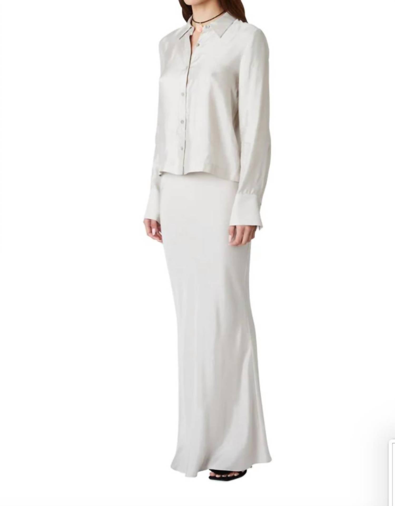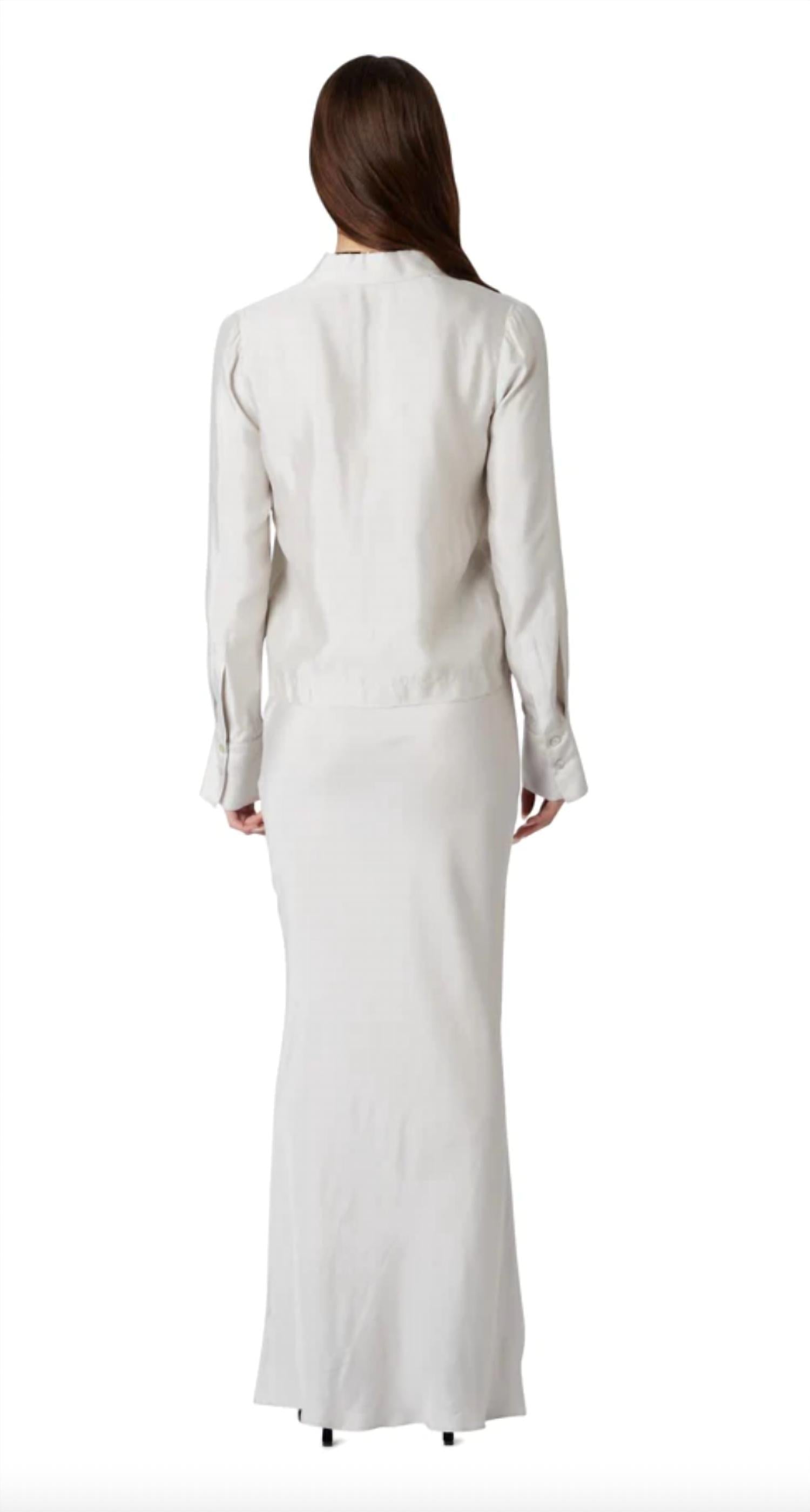 Flowy, comortable and stylish. This maxi skirt is a fan favorite. Slip into the Bias Cut Maxi Skirt by NIA, offering a touch of subtle shimmer in elegant silver. This satin maxi is beautifully cut on the bias, enhancing its minimalist '90s aesthetic, ideal for holiday parties. Featuring a hidden side zipper closure for a seamless silhouette, this skirt embodies effortless chic. Care instructions recommend dry cleaning only to preserve the delicate satin finish.