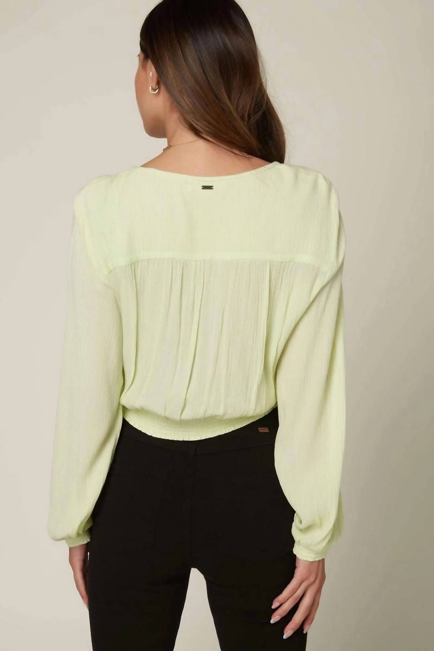 The perfect long sleeve tee that goes with just about anything. The O'Neill Freely Long Sleeve Top in Mint is a refined essential for any modern wardrobe. Crafted from breathable 100% viscose, this woven long-sleeved top offers a relaxed silhouette with a graceful front wrap design. Delicate smocking details at the cuffs add a subtle texture, while the pull-on closure and solid color wash maintain a polished aesthetic. Care is easy with machine wash instructions, making this top perfect for transitioning from casual to elevated occasions.