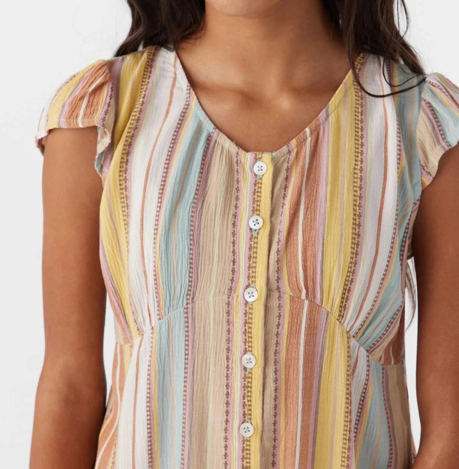 Add a splash of style to her wardrobe with the O'Neill Girls' Rubie Short Dress, featuring a chic stripe pattern in Multi Color. This casual summer dress boasts short sleeves and an empire waist silhouette, perfect for any dinner party occasion. Made from 100% viscose crinkle yarn dye for a comfortable fit, it measures 28 1/2'' in length. The functional button-up placket adds a classic touch, while the crewneck design enhances its minimalist trend. Care: Machine wash.