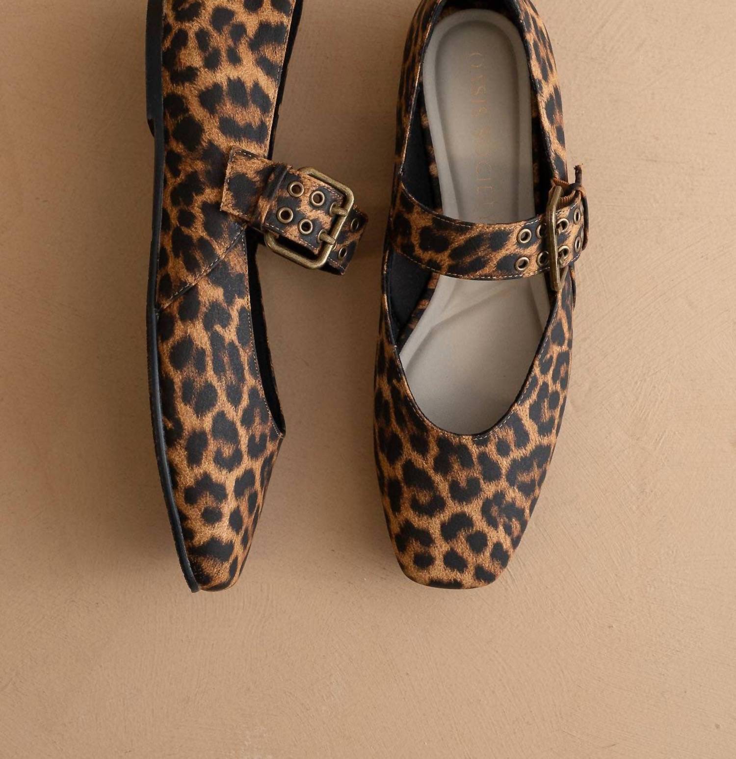 A preppy yet feminine take on the classic loafer. Introducing the Women's Soho Ballet Flat by Oasis Society, a stunning leopard print shoe designed to elevate the ballet core trend with edgy sophistication. Crafted from vegan leather, these flats feature a studded buckle strap and are designed exclusively in California. The Dream Cloud Cushion insole ensures unparalleled comfort, while the rubber sole provides durability. With a round toe and a flat heel height of 0.25", these flats are perfect for travel or everyday wear.