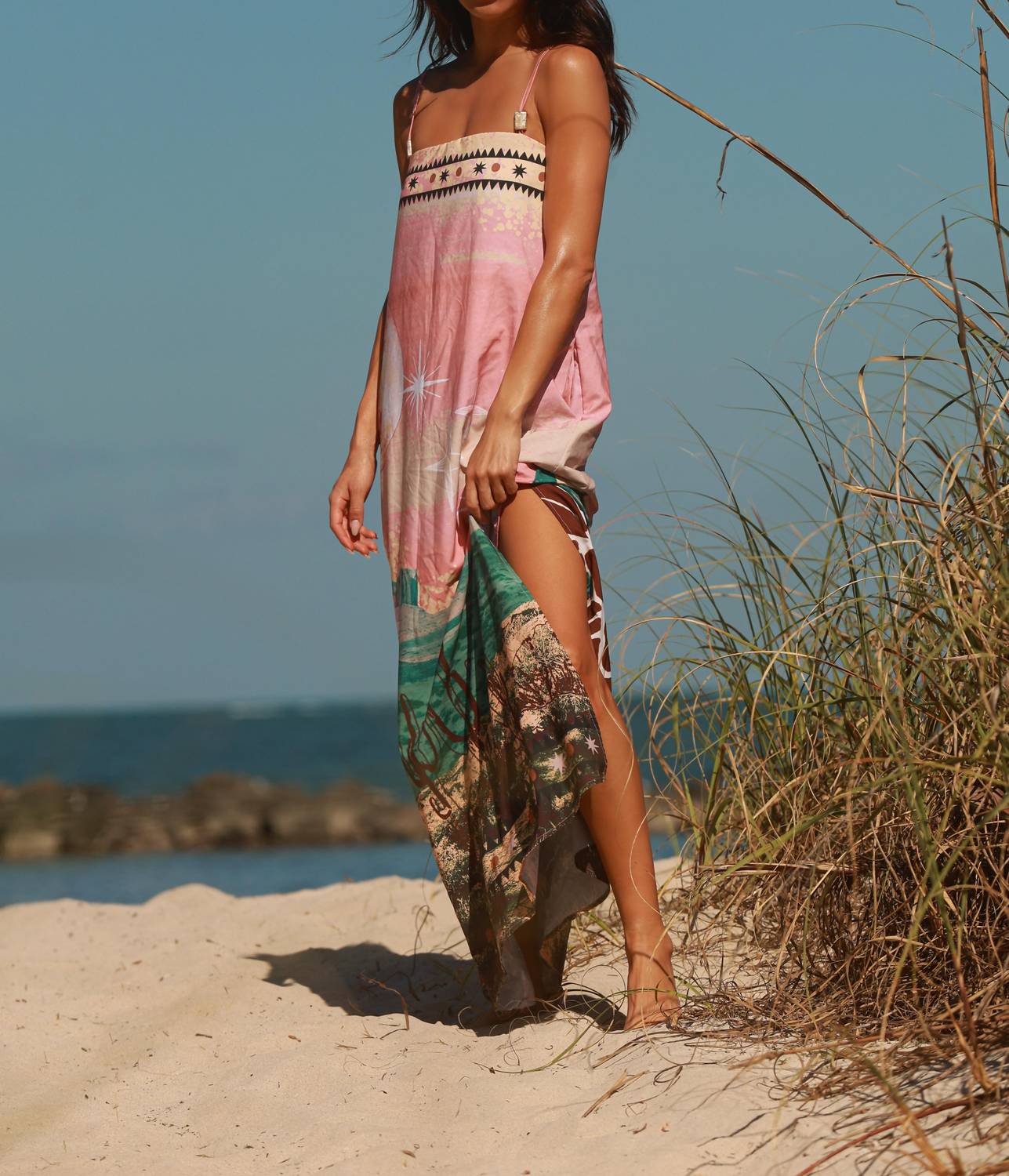 Who doesn't love a good maxi dress? This one you'll be reaching for season after season. Embrace boho chic with the Ola Azul Celeste Desert Dress, a captivating maxi designed to elevate your vacation wardrobe. Featuring spaghetti straps and a square neckline, this shift silhouette offers adjustable straps for a custom fit. Made in Colombia, it boasts a vibrant placement print crafted from 93% Polyester and 7% Elastane. With a convenient pull-on closure, it is ideal for carefree summer days.