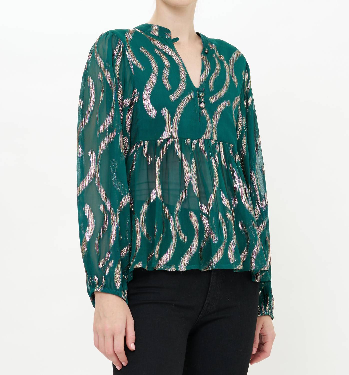 A versatile blouse that works from desk to dinner! Introducing the Mandarin Balloon Top by Oliphant, a must-have piece in vibrant Borealis Jade that captures the essence of quiet luxury. This women's blouse features long, voluminous balloon sleeves and a V-neck, offering a relaxed fit perfect for stylish comfort. Closure: Pull-on. Ideal for a dinner party or St. Patrick's Day, this patterned top effortlessly elevates your look for any spring occasion.