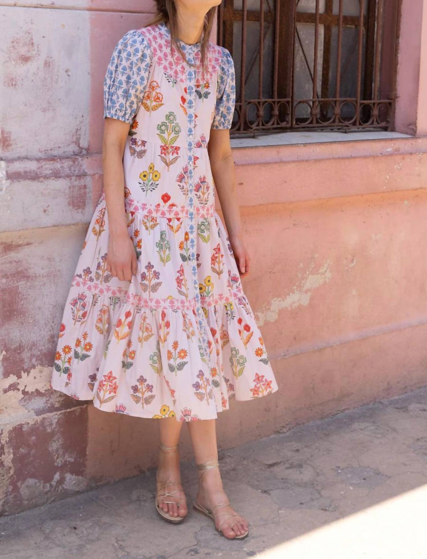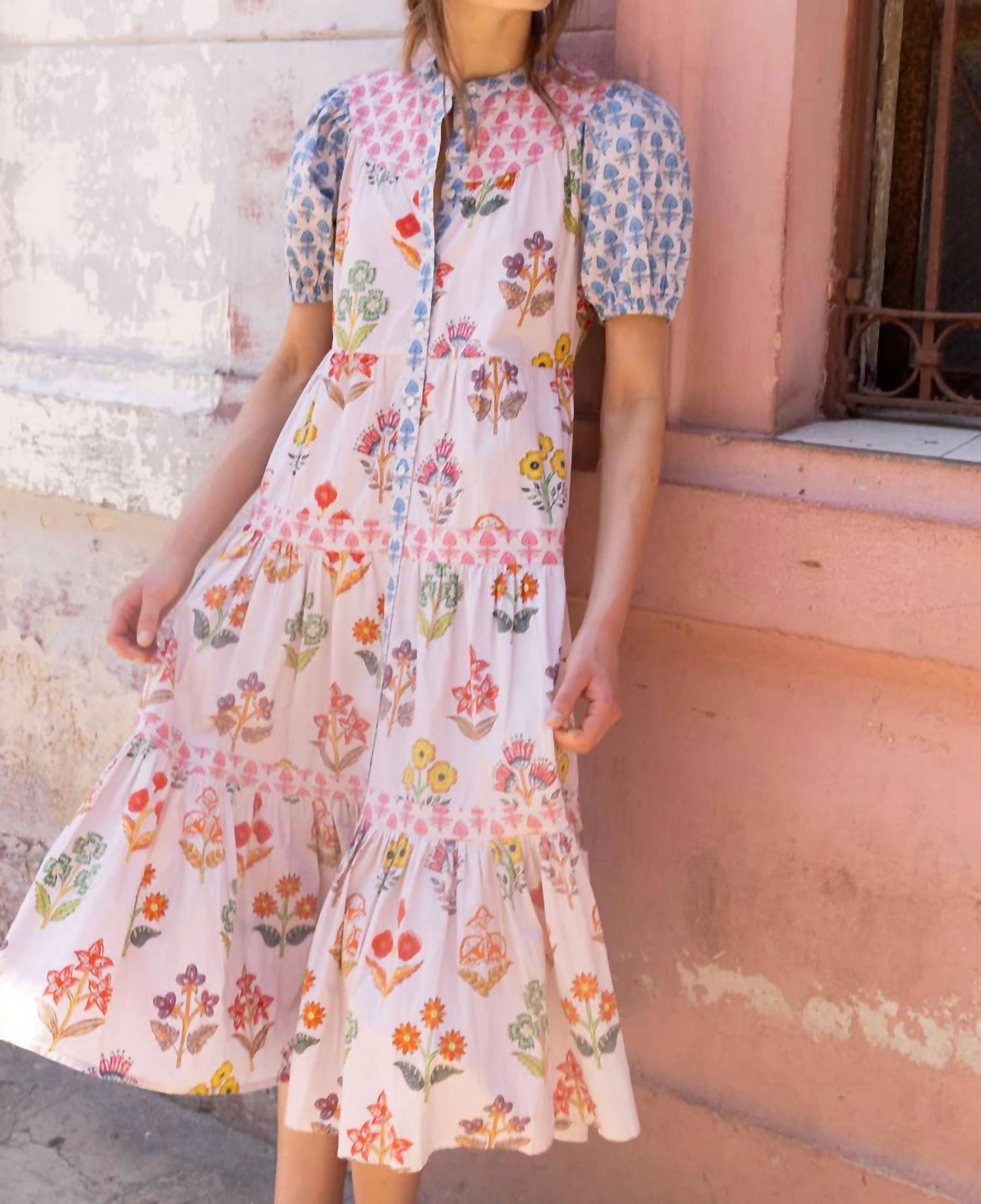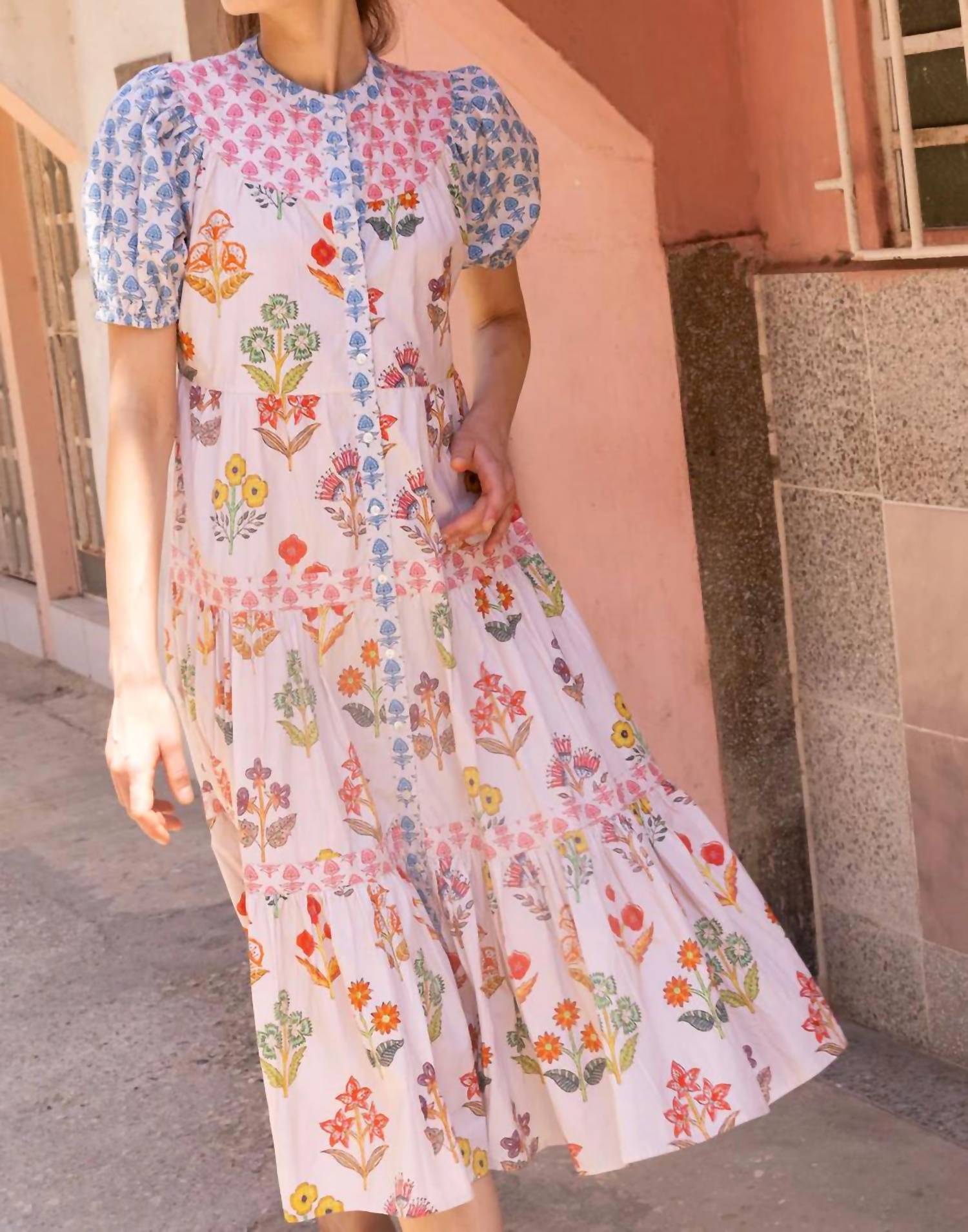 The perfect length dress does exist. Introducing the Scoop Tiered Midi Dress by Oliphant, a stunning floral design in Provence Blue for effortless boho chic style. This piece features short puff sleeves with elasticized cuffs and a scoopneck, with elegant mother of pearl buttons for a refined finish. Expertly crafted from slightly structured cotton poplin, this A-line silhouette dress is perfect for any holiday party. Closure: Button closure. Garment Length: Midi (47" for XS size).