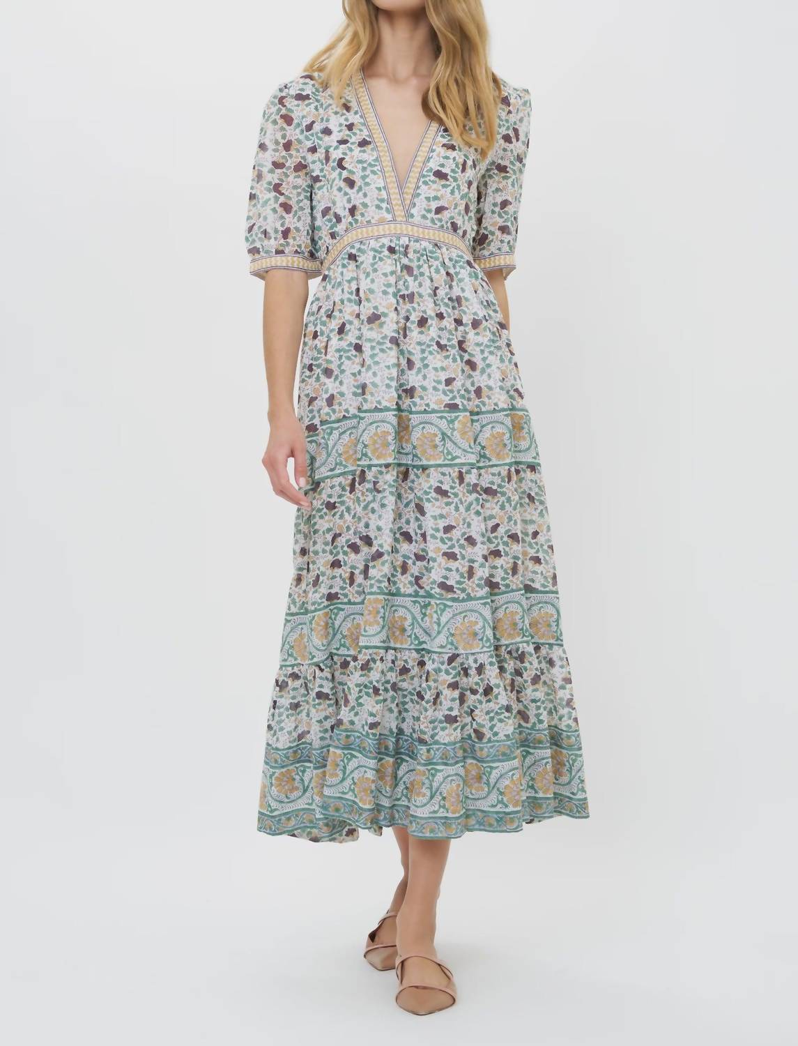 Who doesn't love a good maxi dress? This one you'll be reaching for season after season. Embrace enchanting style with the V-neck Cuffed Maxi Dress by Oliphant, featuring elbow-length sleeves and a tiered silhouette perfect for summer vacations. Crafted from lightweight Cotton Voile, this dress showcases allover hand block printed patterns in a serene Cotswald hue. It offers a hidden side zipper closure for a fitted look, complete with a V-neck and tailored cuffs. Care for this delightful piece by hand washing and line drying.