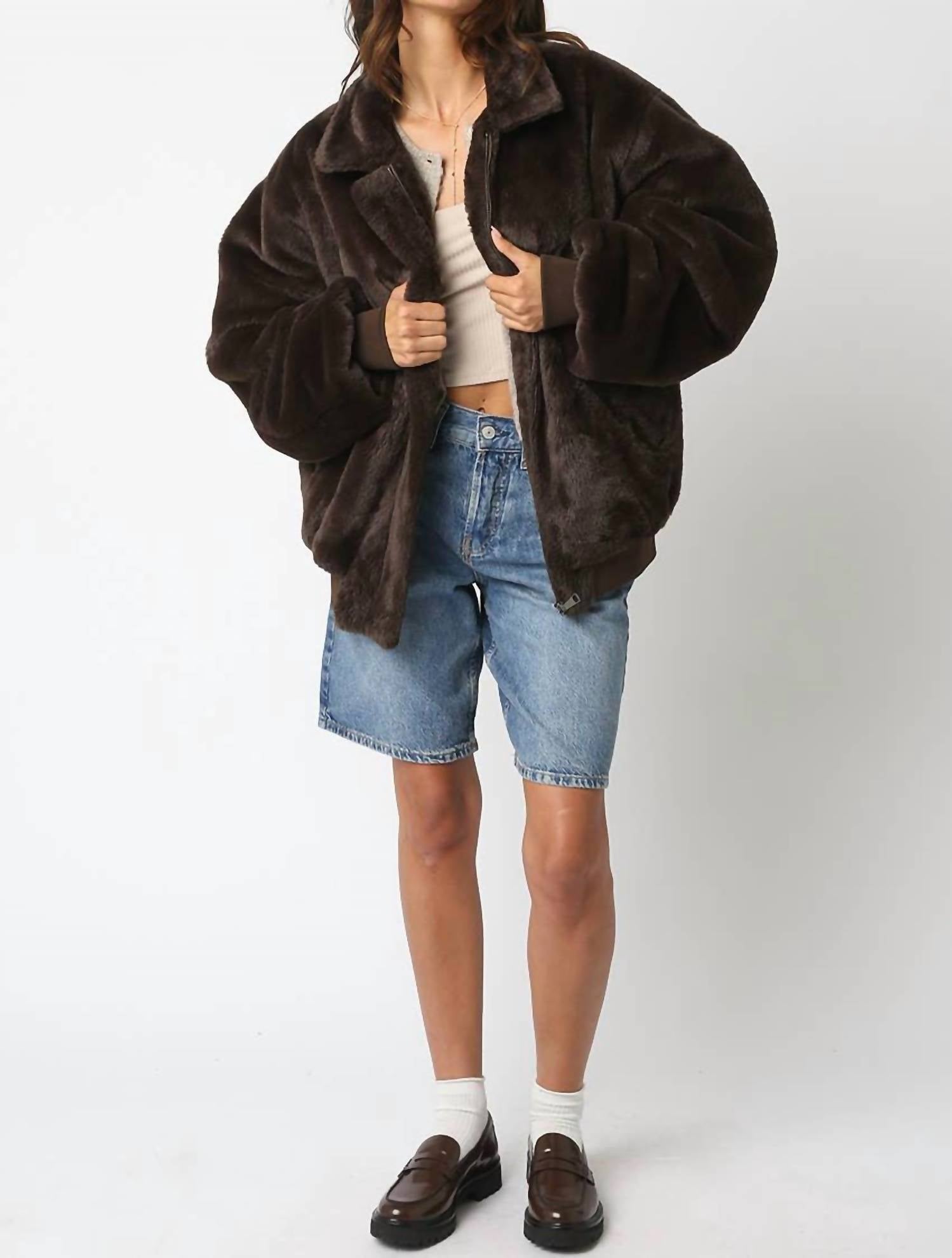 Downright adorable and so comfortable you won't want to take it off. This teddy jacket is a fan favorite. Introducing the Emmy Faux Fur Jacket by OLIVACEOUS, a minimalist statement piece perfect for the winter season. This teddy jacket features long sleeves crafted from a soft, plush faux fur material in a solid brown hue with an oversized fit. It includes a stylish open front and practical front pockets for added convenience. Made from imported materials and fully lined, this jacket offers both style and comfort.