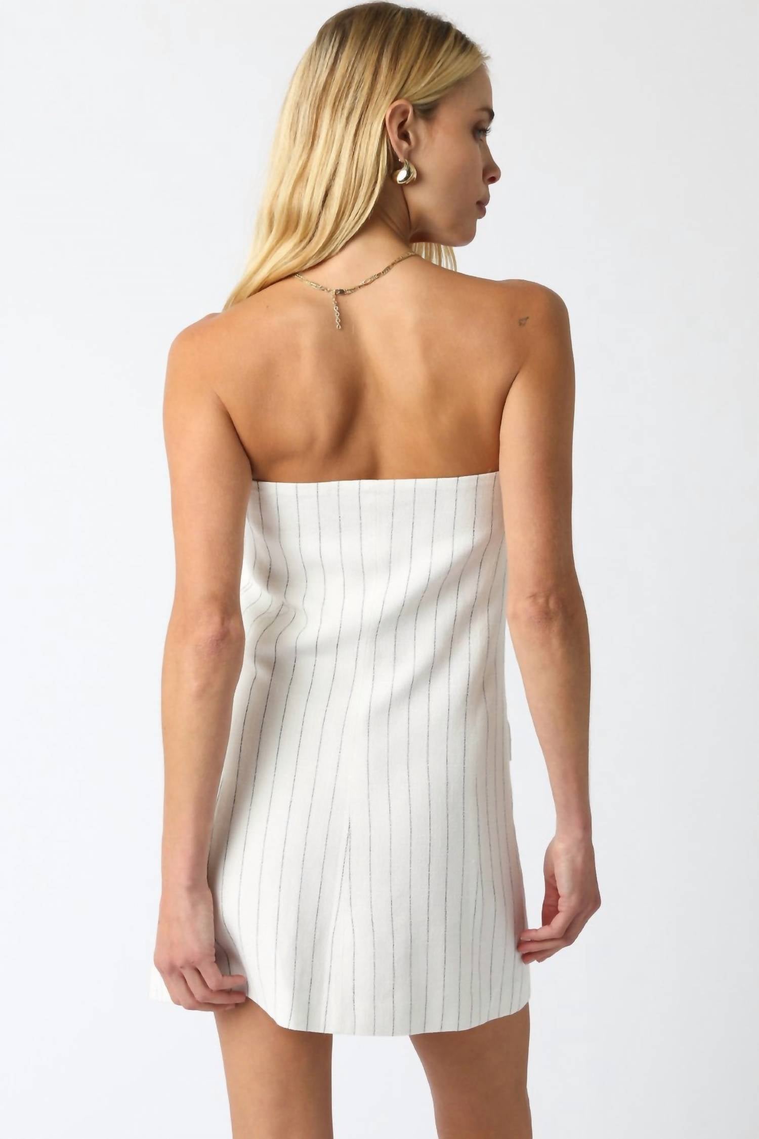The kind of easy and flattering dress you'll be reaching for all season long. Slip into the OLIVACEOUS Freya Stripe Dress, a chic mini perfect for your next cocktail party. This strapless dress features a stylish off-the-shoulder neckline and a form-fitting silhouette that screams 90s fashion. Crafted from a blend of 55% linen and 45% rayon, it offers side utility pockets for a touch of practicality. Closure: Button closure. The white and black stripes add a classic pattern to this summer essential.