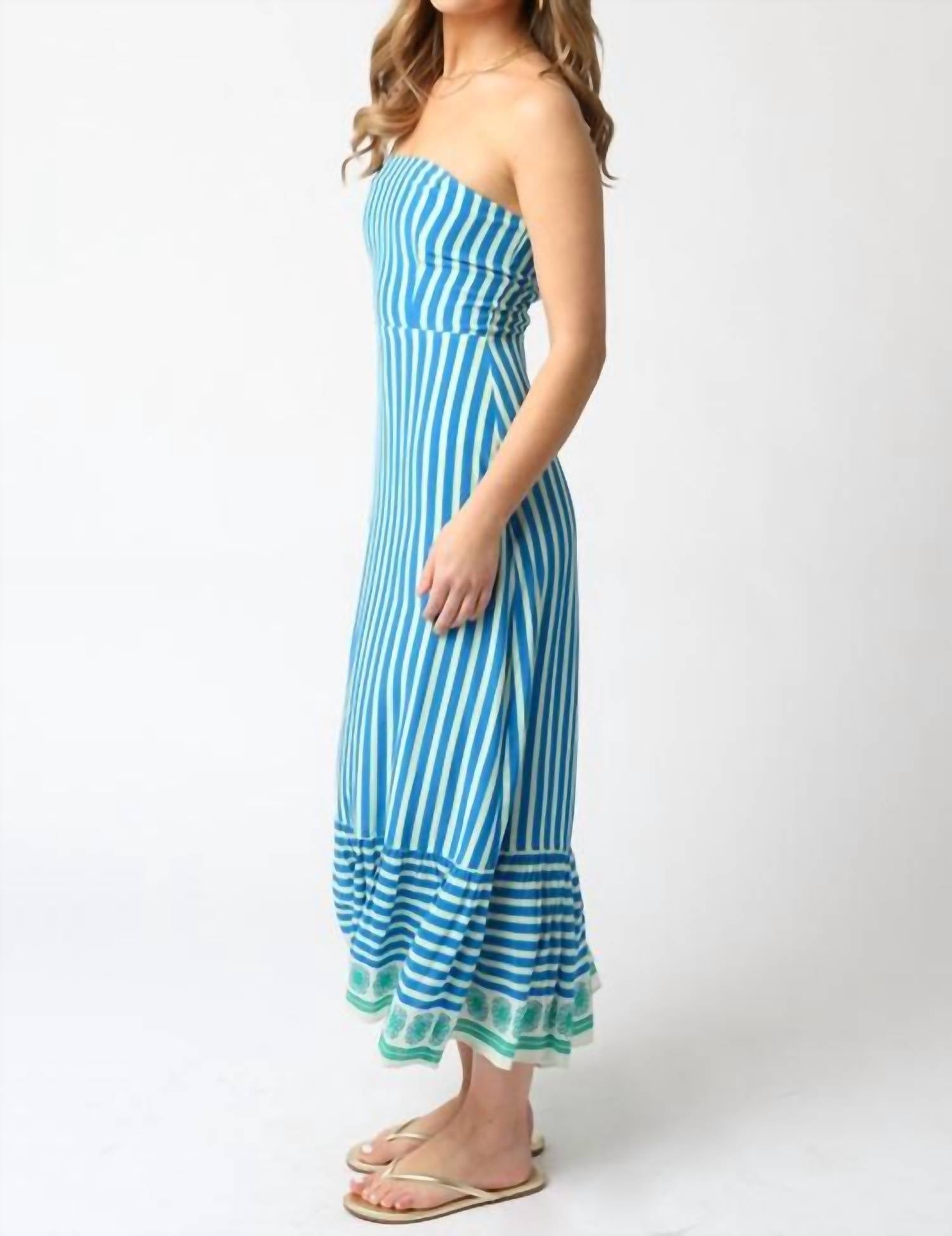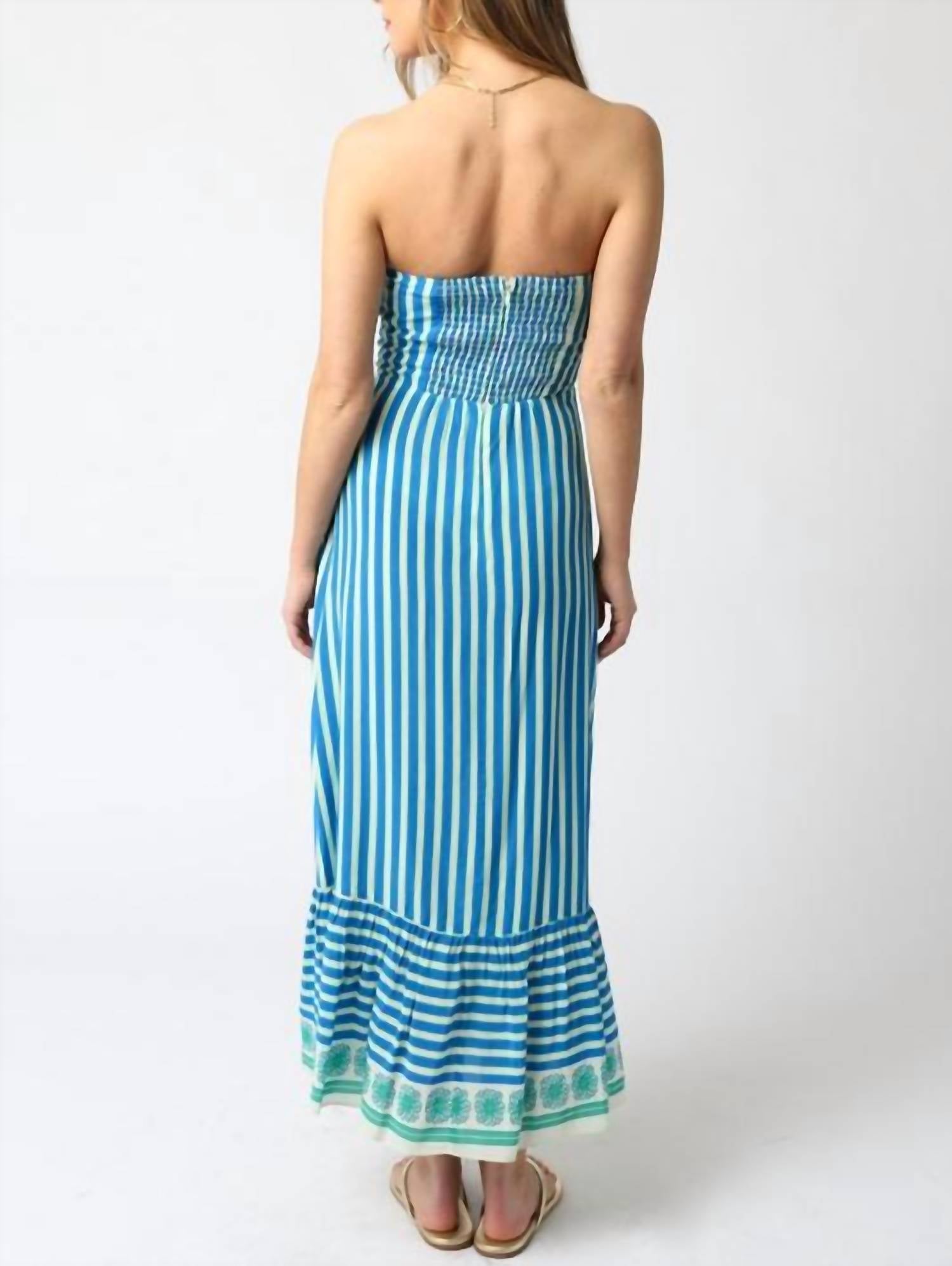 Style this maxi with your favorite statement necklace and sandals for the perfect look. The Selena Stripe Dress by OLIVACEOUS is a perfect choice for beach days, blending 90s fashion with modern elegance. This strapless, off-the-shoulder sheath dress in cream blue is crafted from a soft 40% Viscose and 60% Rayon blend. The maxi length embodies a breezy summer vibe, with a zip closure for a sleek finish. Originating from an undisclosed location, it fits effortlessly into any warm-weather wardrobe.