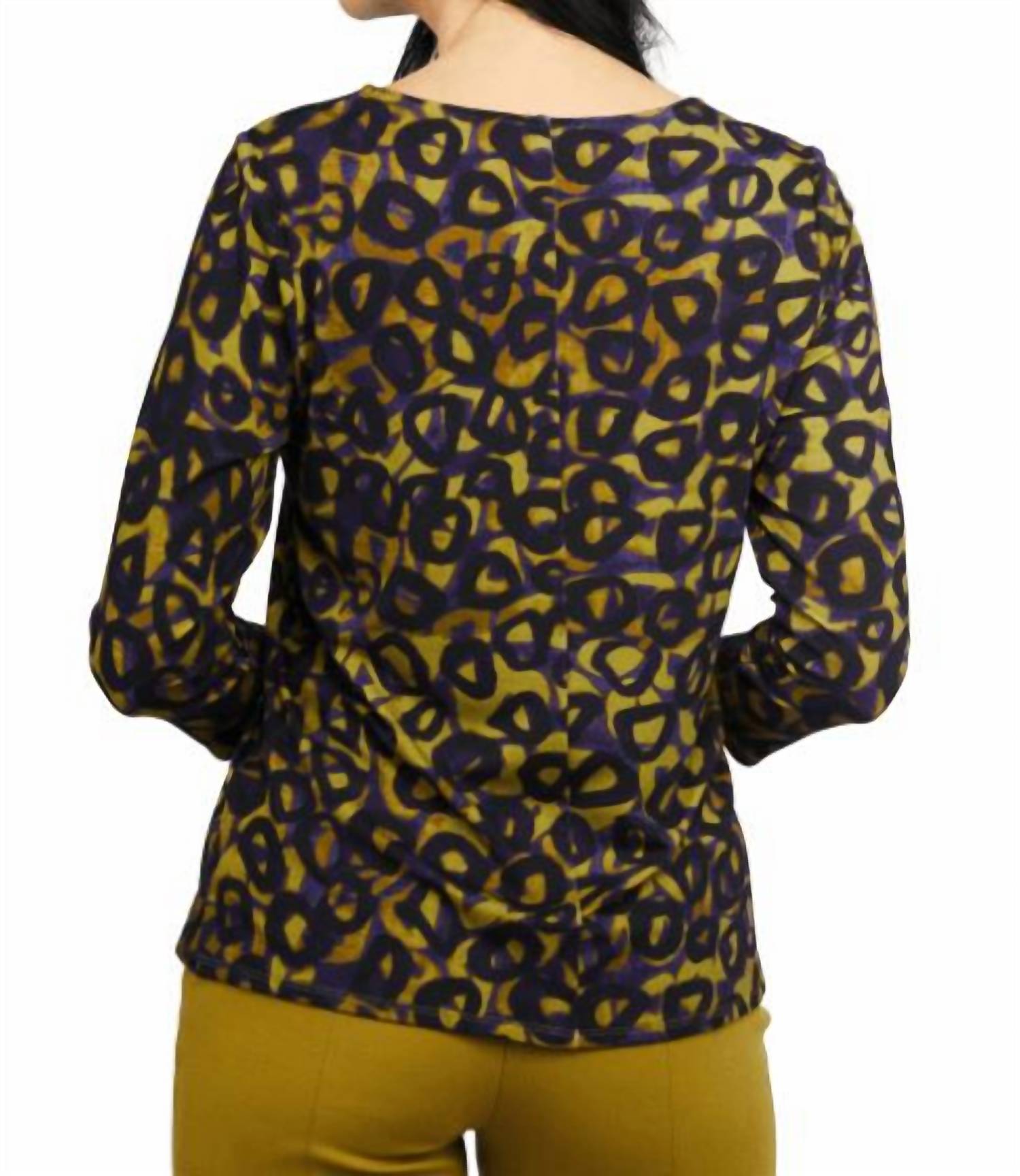 Great fit, cute design, soft fabric. You'll love everything about this long sleeve tee. Olivia by Habitat's Easy Tee is everyday ease with an elevated style. This stretch jersey pullover is designed with a sophisticated mod-inspired graphic of layered black and green circles set against a rich purple ground. The scoop neckline and ¾ sleeves lend classic versatility, while the gently flared A-line silhouette with a notched hem flatters and falls gracefully at the hip. Luxuriously soft yet effortlessly stylish, this piece transitions seamlessly from casual to work to dressy. Medium: Bust 38”, Back Length 25” Machine wash cold, gentle, tumble dry low