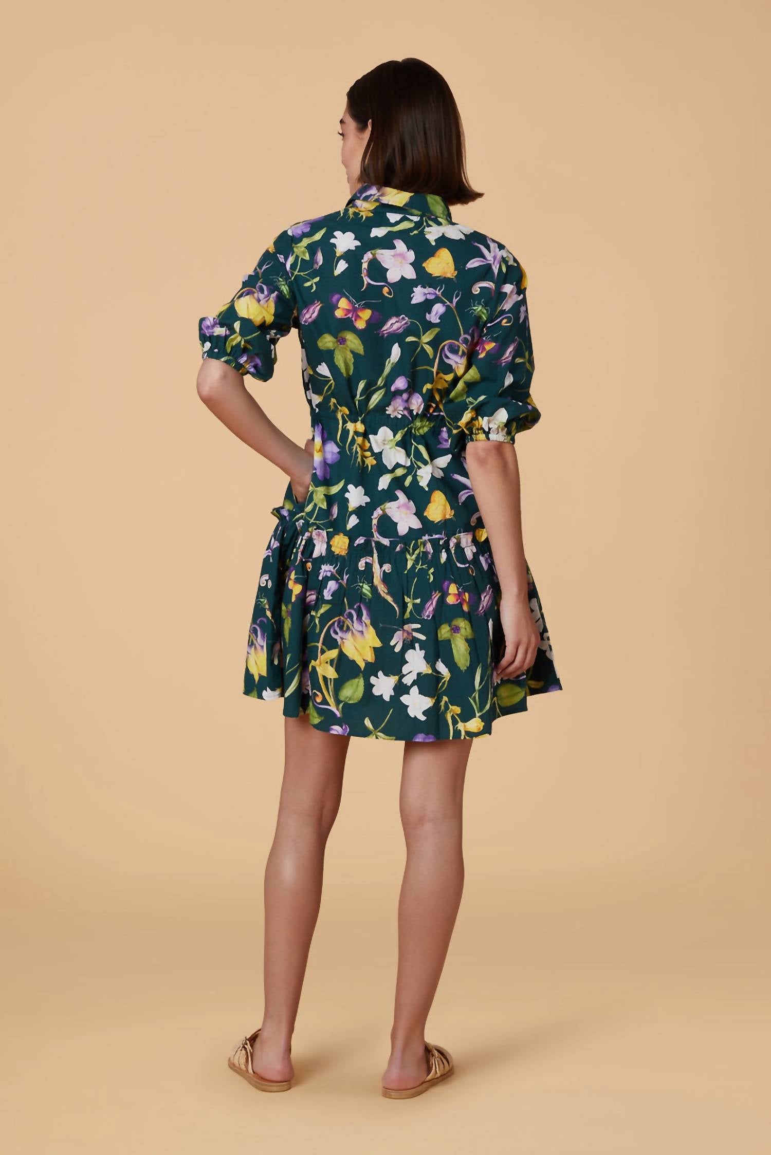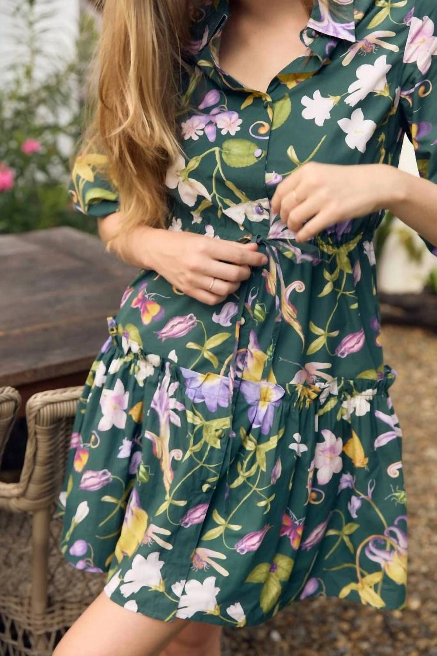 The kind of easy and flattering dress you'll be reaching for all season long. Introducing the Brynn Floral Mini Dress by Olivia by Livro, a captivating blend of boldness and romance with its lush botanical print in deep green. The dress features three-quarter sleeves with elasticized cuffs and a flattering fit and flare silhouette, highlighted by a drawstring waist and tiered skirt for added movement. Crafted from polyester with a collared neckline and button closure, this piece is designed in Charleston and made in India. Care instructions recommend hand washing and line drying.