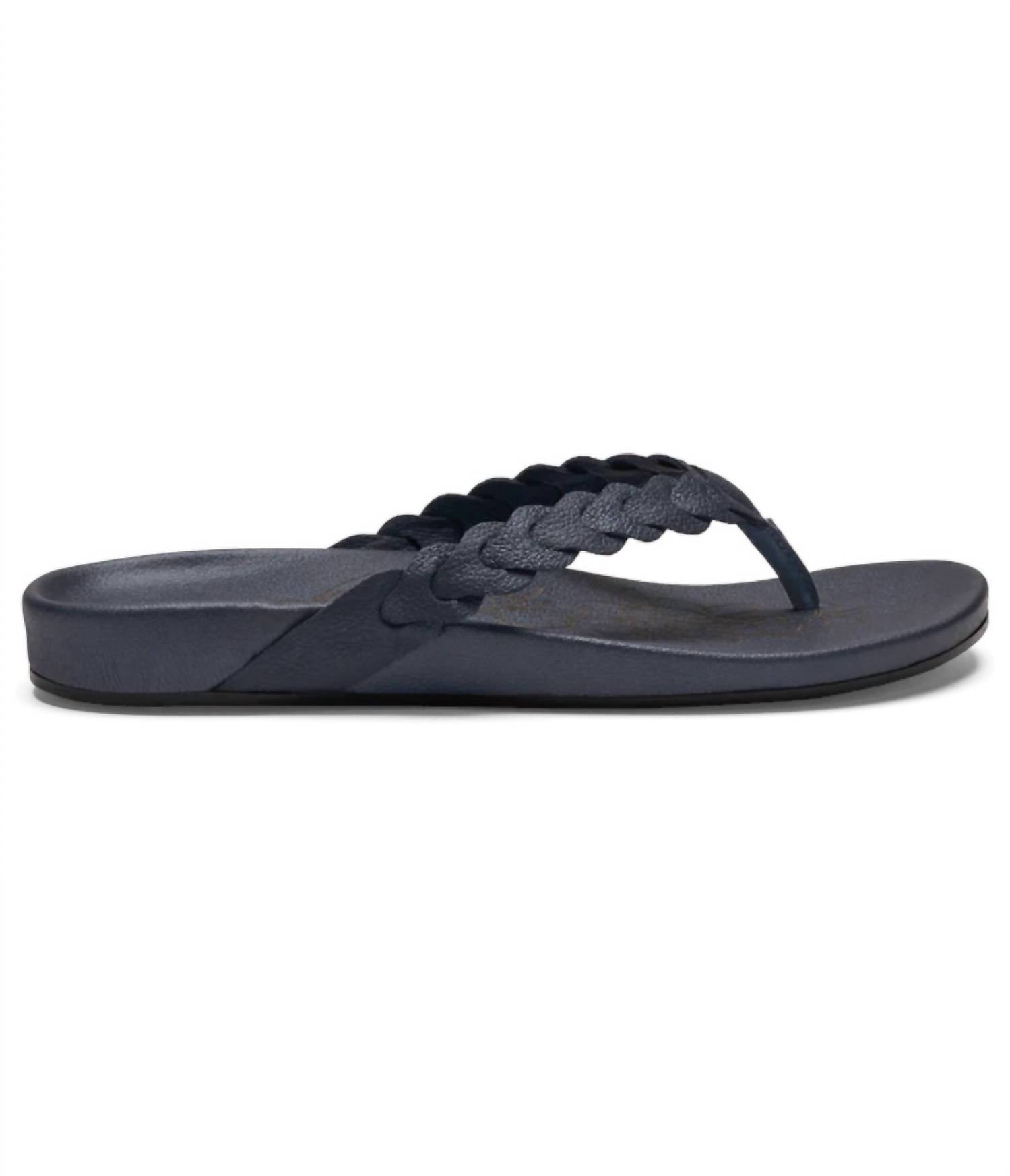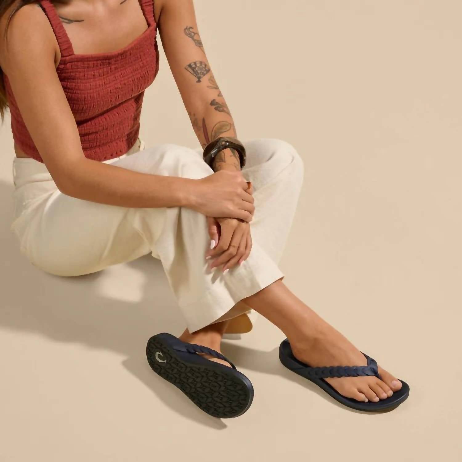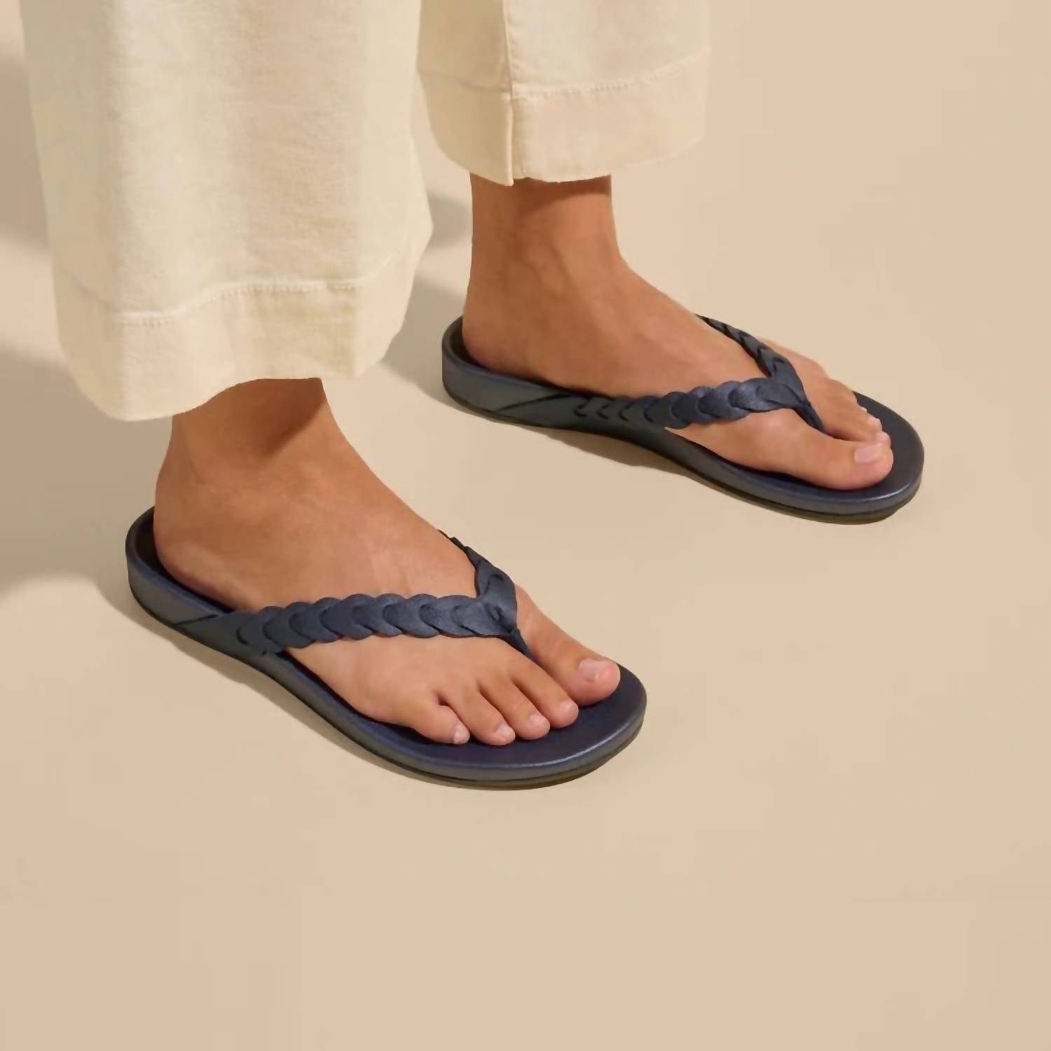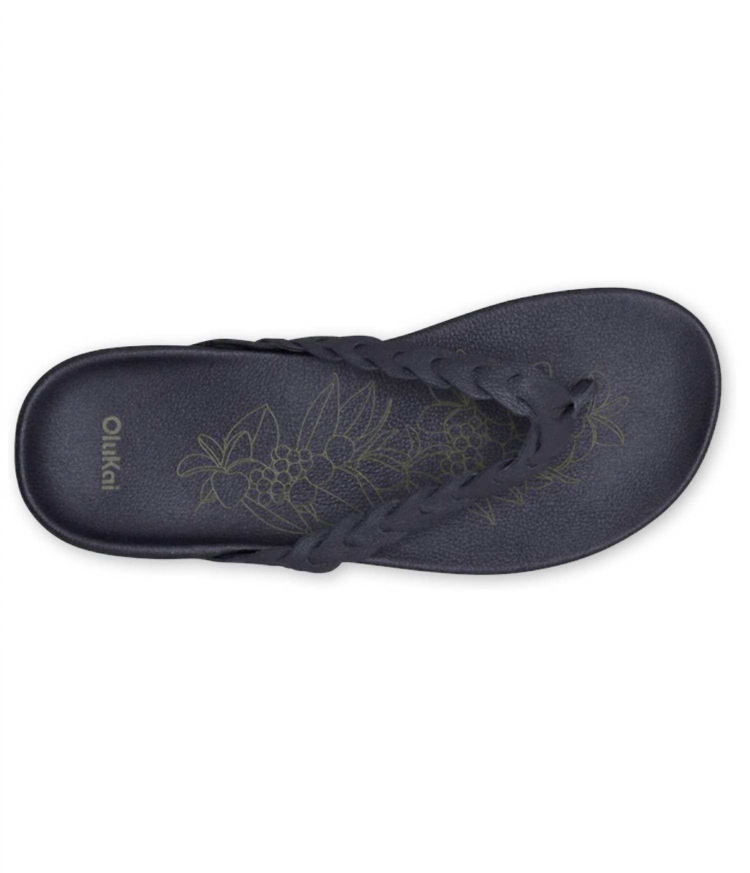 Classicly cute and all-day-wearable. We love this sandal. Step into island-inspired elegance with the Women's Lei Sandals by OluKai in Mood Indigo. Crafted from soft leather, these sandals showcase interwoven straps that reflect the beauty of a Hawaiian lei, complete with laser-etched floral details for an artistic flair. Experience all-day comfort with the cushioned PU footbed that is designed to maintain its shape. Ideal for summer vacations or streetwear trends, these sandals feature an open toe and flat heel design with a medium width fit.