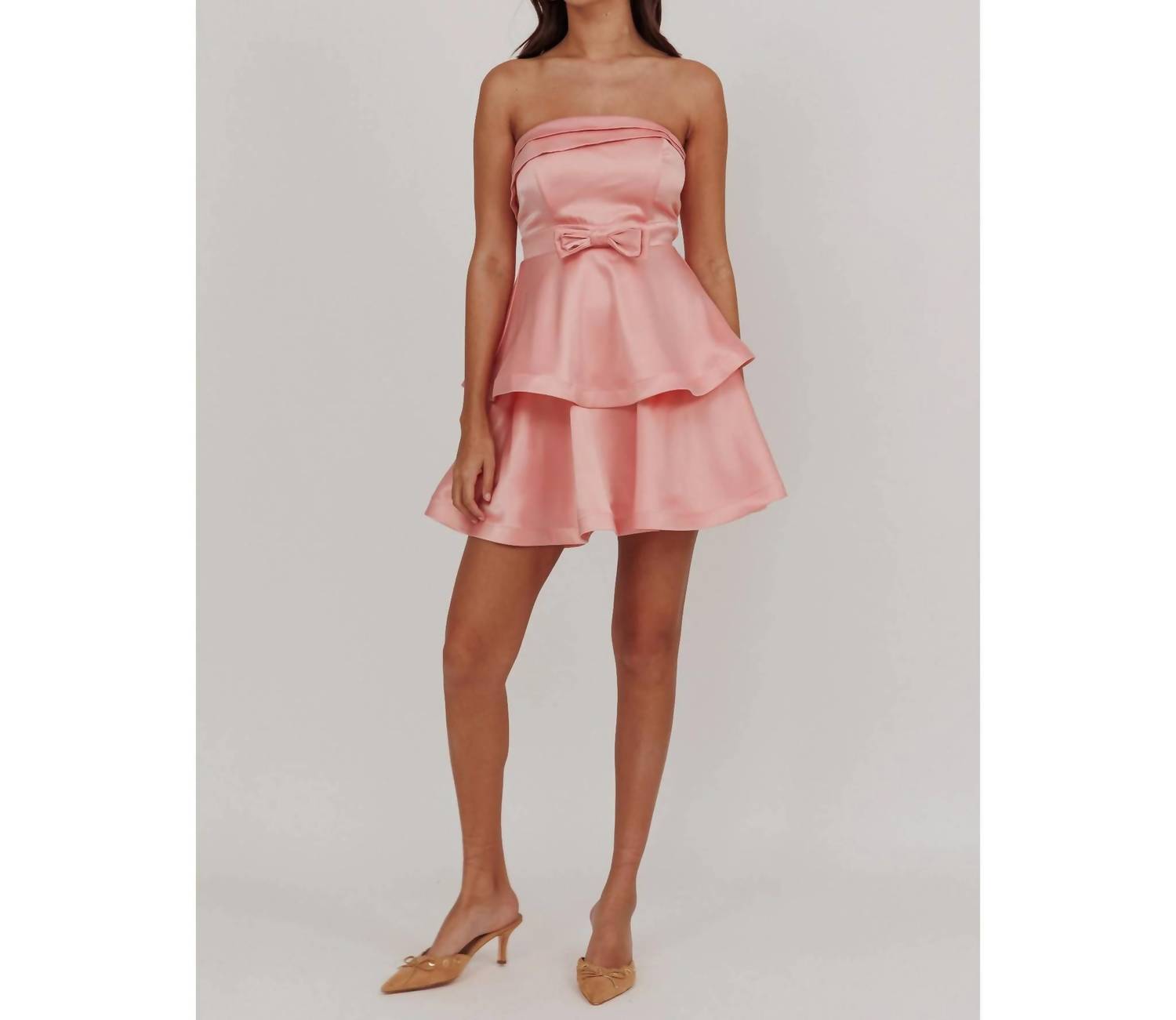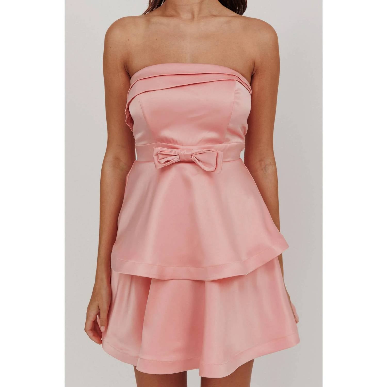 No straps necessary! Stunning piece in solid pink perfectly crafted for women who adore elegance. Strapless dress, featuring a fit and flare silhouette with a tiered skirt and a chic square neckline. Crafted from luxurious satin. Designed with a stylish back zip closure for ease. Hand wash to maintain its exquisite texture and elegance.