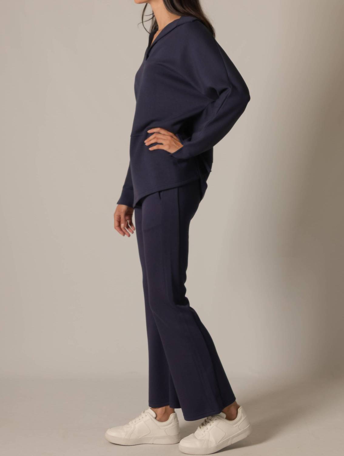 Great fit, cute design, soft fabric. You'll love everything about this long sleeve tee. Introducing the Butter Modal Collared Top by P.CILL, a sophisticated women's navy piece crafted for winter sophistication. This long sleeve tee features a collared v-neckline, slit cuff details, and side slits for a relaxed fit. Composed of 48% Modal, 48% Polyester, and 4% Spandex, its pull-on style ensures ease of wear. Embrace a solid pattern in a versatile top that seamlessly combines comfort with elegance.