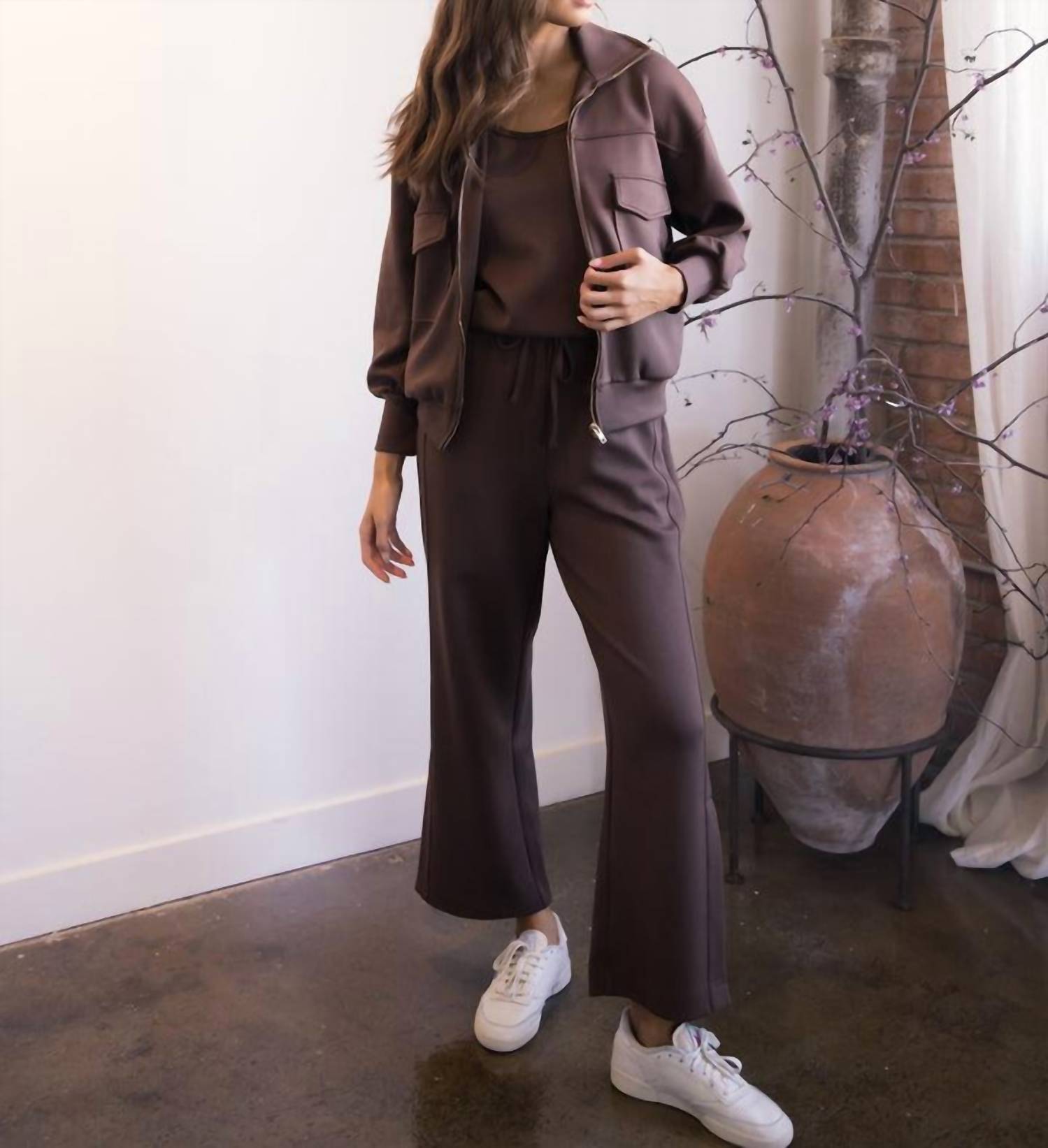 A riff on your favorite classic bomber jacket. Introducing the Lila Butter Modal Bomber Jacket by P.CILL, an elegant twist on a wardrobe staple. With long sleeves crafted from ultra-soft modal, this piece offers exceptional comfort paired with a stylish twist in a rich cocoa shade. It features a gold zip closure, oversized patch pockets, a classic collar, and ribbed trim for a chic streetwear vibe. Country of origin is not specified. Care instructions: Machine wash and line dry. Ideal for travel and fall occasions, this jacket masterfully combines function and form.