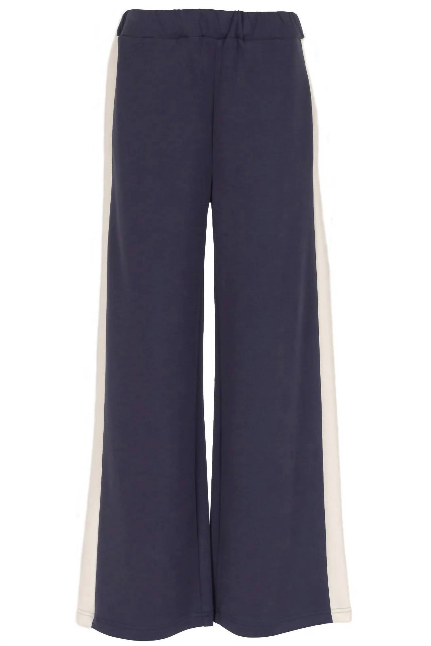 Introducing the Lula Side Stripe Wide Leg Pants by P.CILL, a perfect blend of laid-back ease and bold design in classic navy. These wide-leg pants are crafted from a breathable fabric made up of 48% Modal, 48% Polyester, and 4% Spandex, ensuring comfort and a structured feel. Feature details include a stylish contrast side stripe and a pull-on elastic waistband, complemented by an inseam of 27" for size small. Care is effortless with options for machine wash or gentle hand wash in cold or warm water, followed by hanging dry.