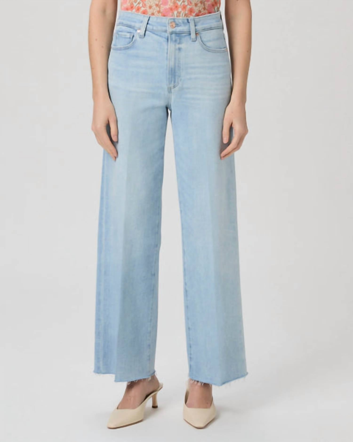 Elevate your denim collection with the Paige Anessa 31" Wide Leg Jean in Suki Distressed, designed with a relaxed and comfortable fit. This high-rise jean, with its raw hem and light wash, embodies minimalist style perfect for summer vacations or Mother's Day outings. Made from a cotton blend with 91% cotton, 7% polyester, and 2% spandex, these jeans offer the ideal balance of softness and stretch. Featuring a zip closure and functional pockets, they are easy to care for with machine wash cold instructions and line drying.