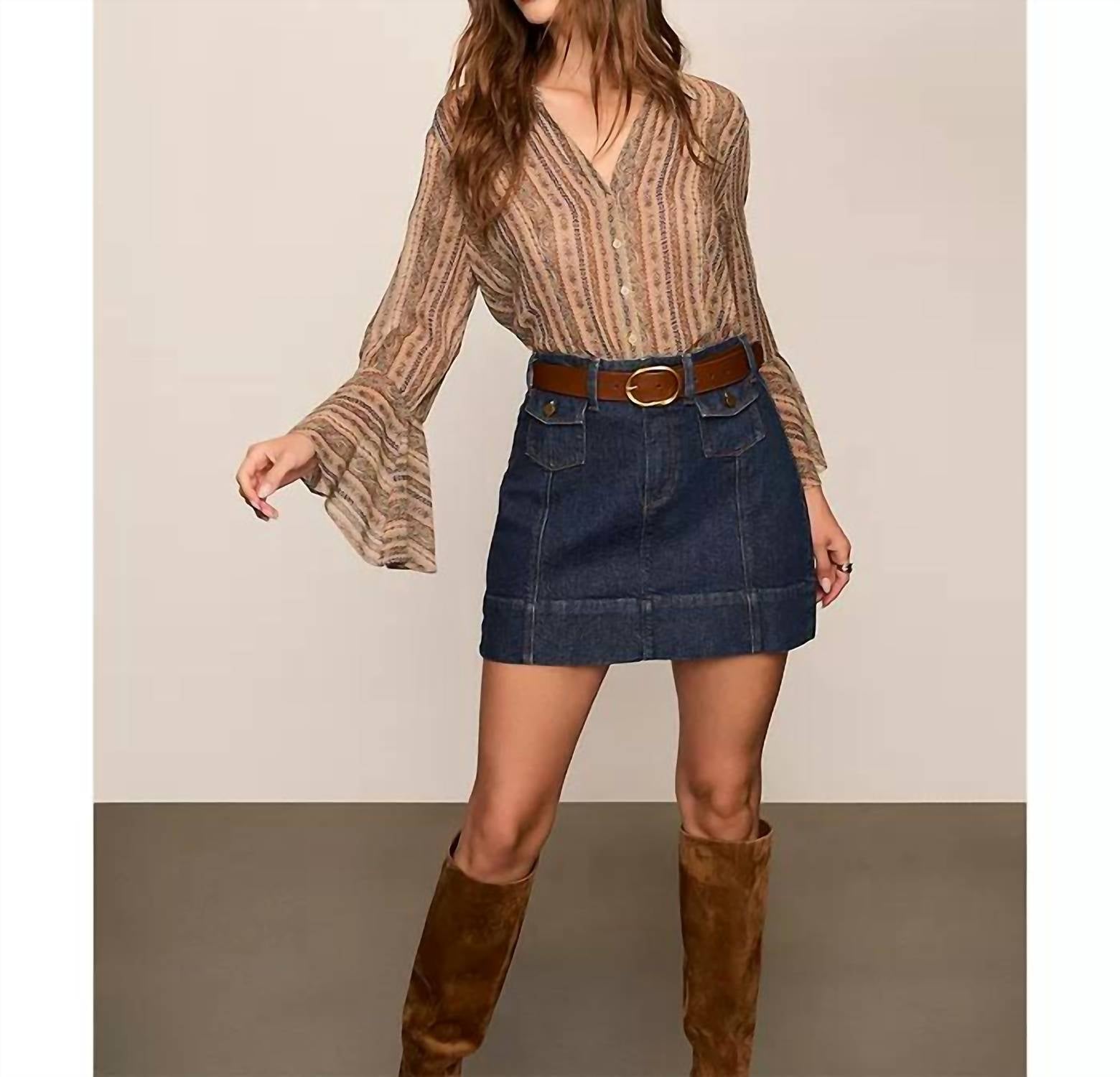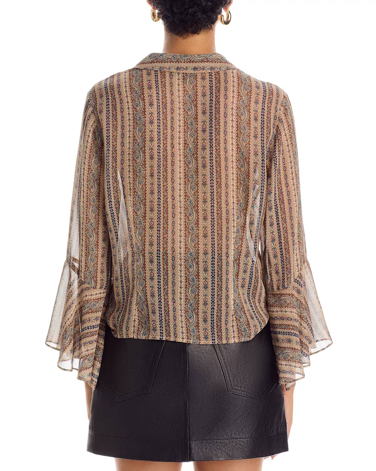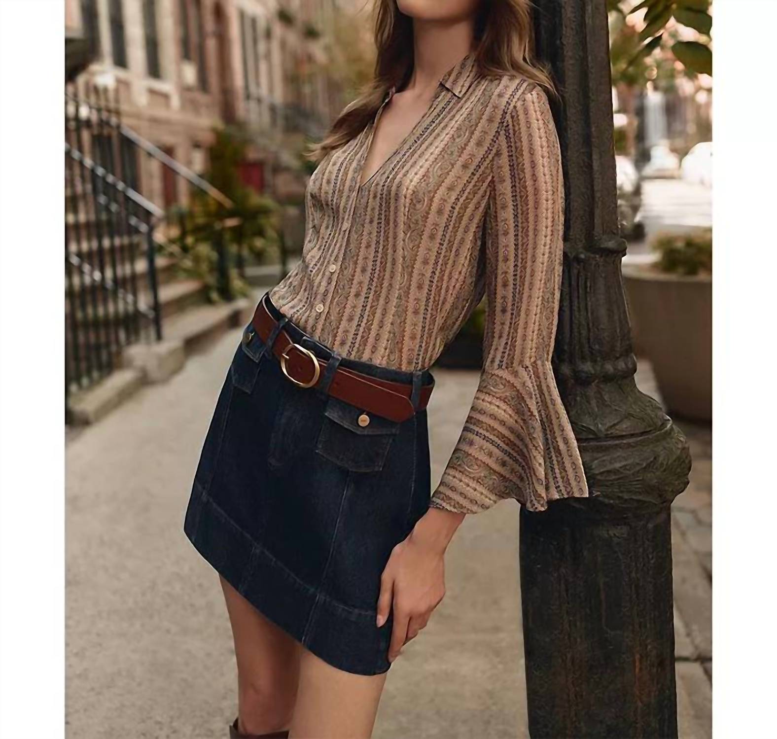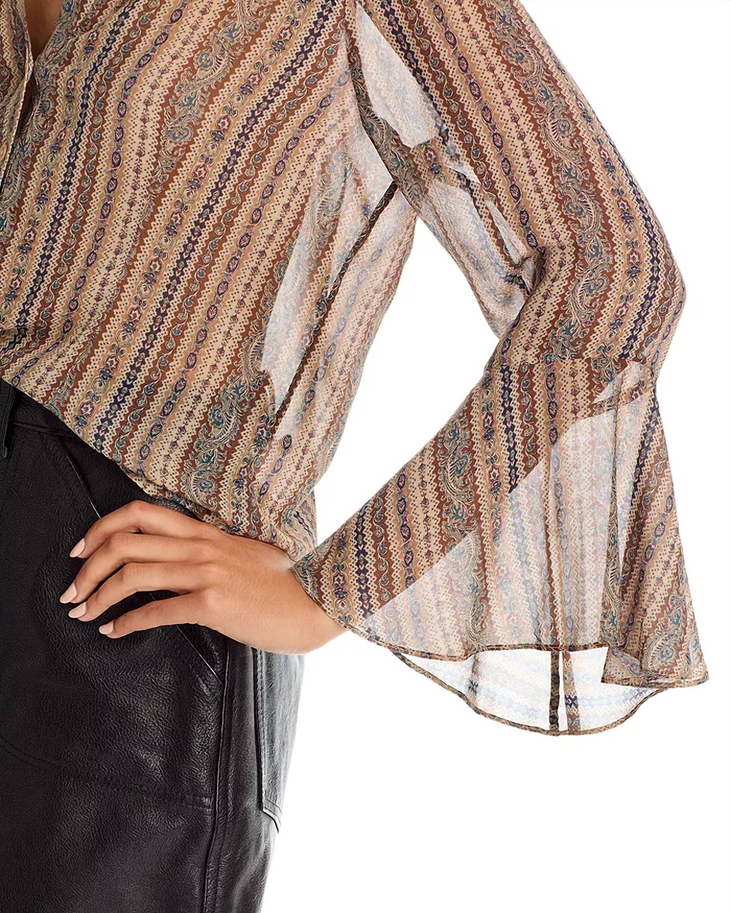 A timeless blouse that will never go out of style. Introducing the Jasmeet Silk Blouse by Paige, a sophisticated choice for your wardrobe in a brown multi tapestry-inspired stripe. This elegant blouse features long flared bracelet-length sleeves and is made from luxurious 100% silk flat georgette, ideal for a refined dinner party. With a collared V-neckline and button closure, it boasts an imported pedigree at a perfect 21.5-inch length for mid to high-rise denim. Care is simplified with dry clean instructions.