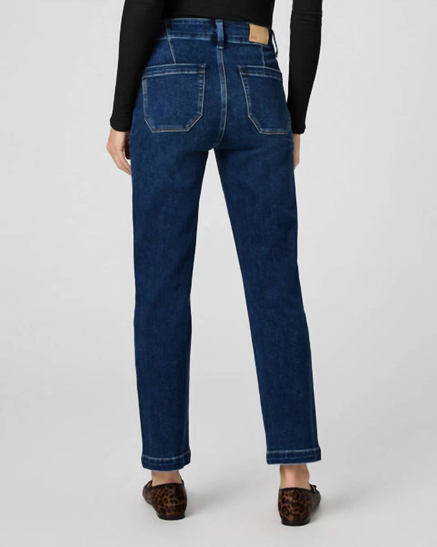 We especially love this cropped jean with a cute pair of slides or sandals. Introducing the Mayslie Straight Ankle Jean by Paige, a stylish choice in a soft, dark Dresden wash. These pants feature a mid-rise waist with a 9 5/8” rise and a straight leg style that finishes at a 28” inseam. Designed for comfort and style, they are crafted from 93% Cotton, 5% Polyester, and 2% Spandex imported TRANSCEND VINTAGE denim. Closure: Button closure. Care: Machine wash and tumble dry. Model is wearing a size 26 (5'10" height).
