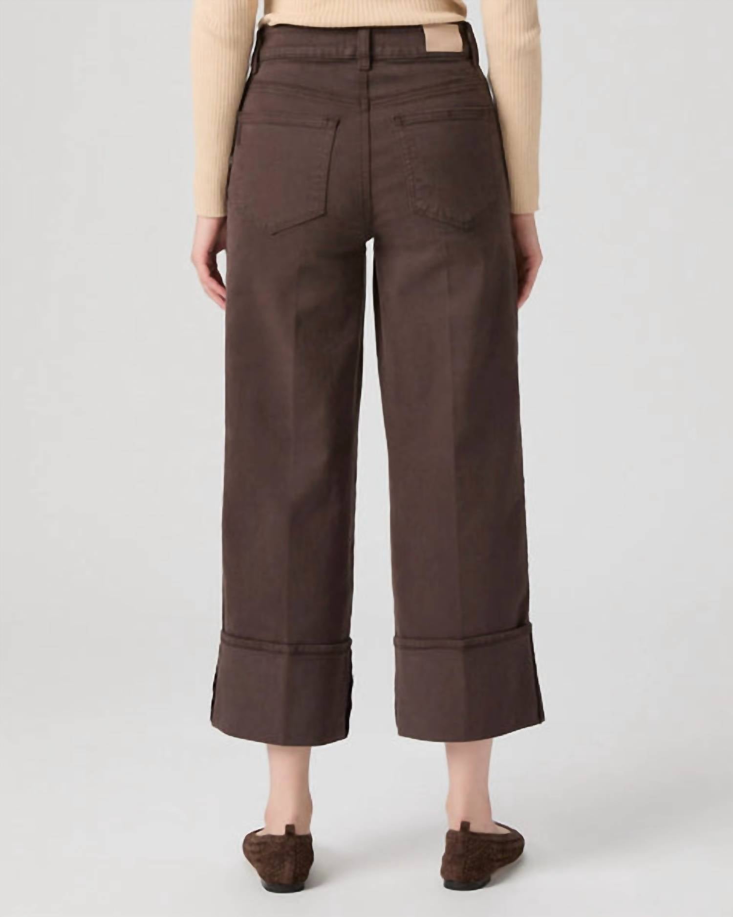 The Sasha Ankle Wide Cuff in Rich Chocolate by Paige is a chic and versatile addition to any wardrobe. Featuring a comfortable high rise and a relaxed wide-leg silhouette, these pants offer both structure and ease. Made from a cotton blend (98.5% organic cotton and 1.5% elastane), the design includes a distinctive turned-up cuff and a silver button closure. Boasting a 5-pocket design, this solid-patterned piece is ideal for summer travel, easily transitioning from day to night. Care: Machine wash and tumble dry.