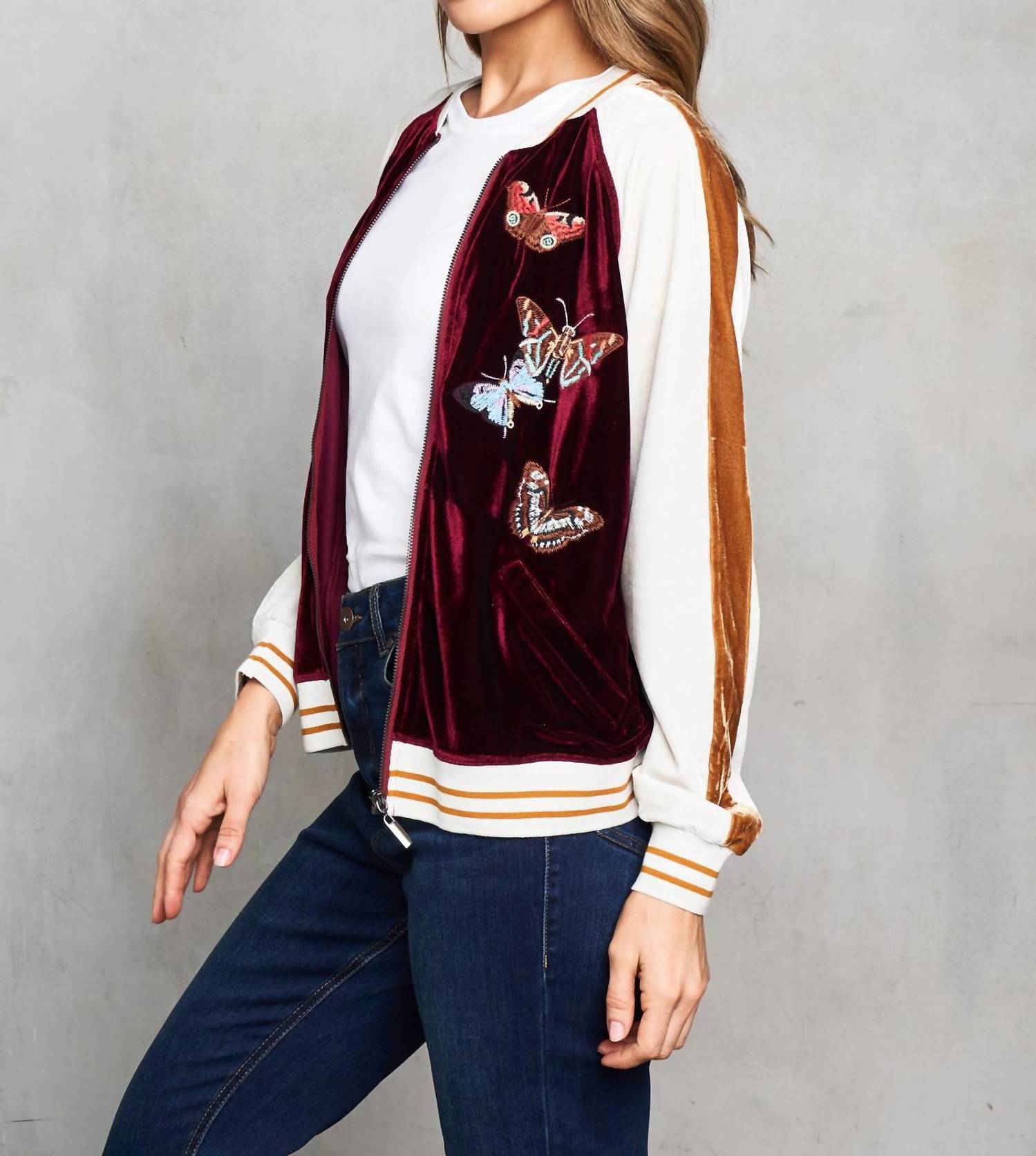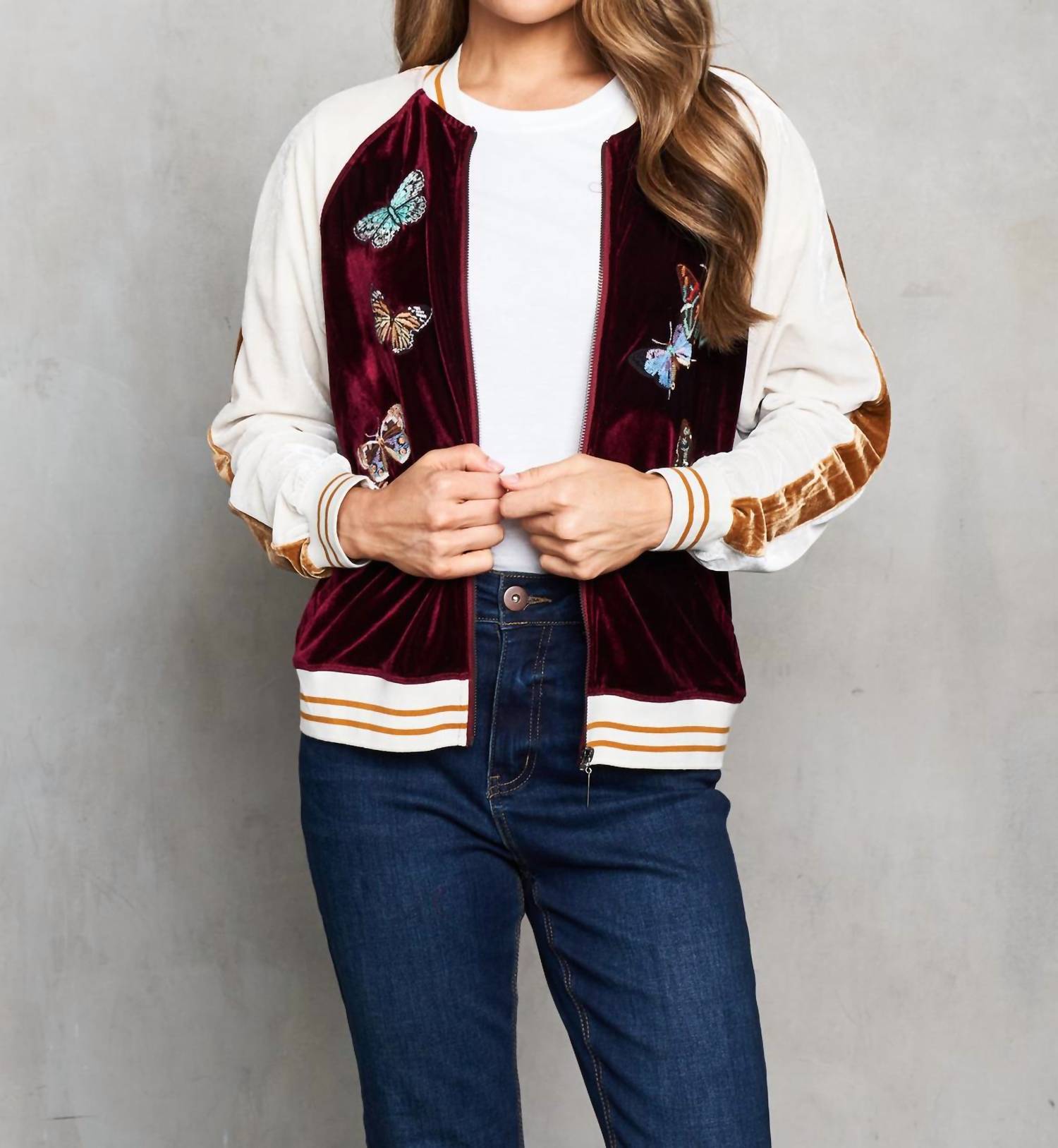 The varsity jacket is a trend that isn't going anywhere anytime soon and we are here for it! Discover the Embroidered Velvet Baseball Jacket by PAPARAZZI, an elegant fusion of contemporary and vintage aesthetics. Featuring long sleeves and crafted from velvet with 95% Polyester and 5% Spandex, this piece offers a rich wine color complemented by a striking floral pattern. Originating from a sporty varsity jacket style, it includes a practical zip closure and pockets for added functionality. Perfect for fall travel, this jacket should be machine washed as instructed.